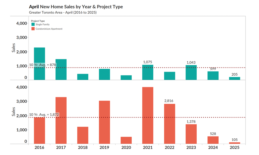 A mere 310 new home sales were recorded across the entire GTA in April — the seventh consecutive month that saw sales hit historic lows, surpassing the infamous 1990 downturn. For context, a typical April would historically see around 2,750 new home sales, according to the latest data from the Building Industry and Land Development Association (BILD).