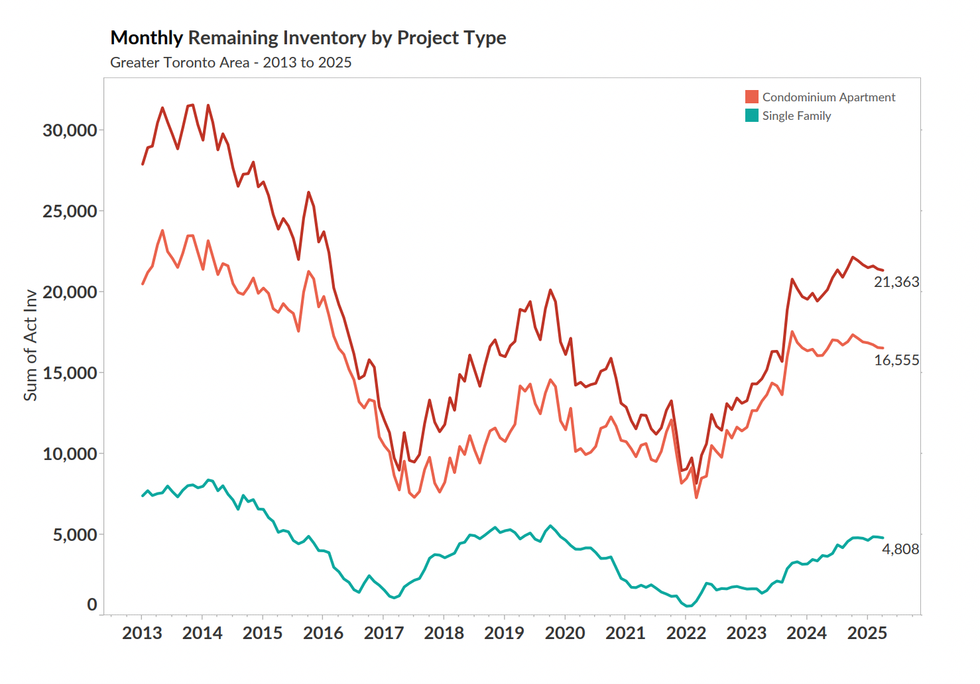 Returning to the April data, inventory ticked down from 21,707 in March to 21,363 units but remains well above average levels at 15 months of inventory. This includes 16,555 condominium apartment units and 4,808 single-family dwellings.