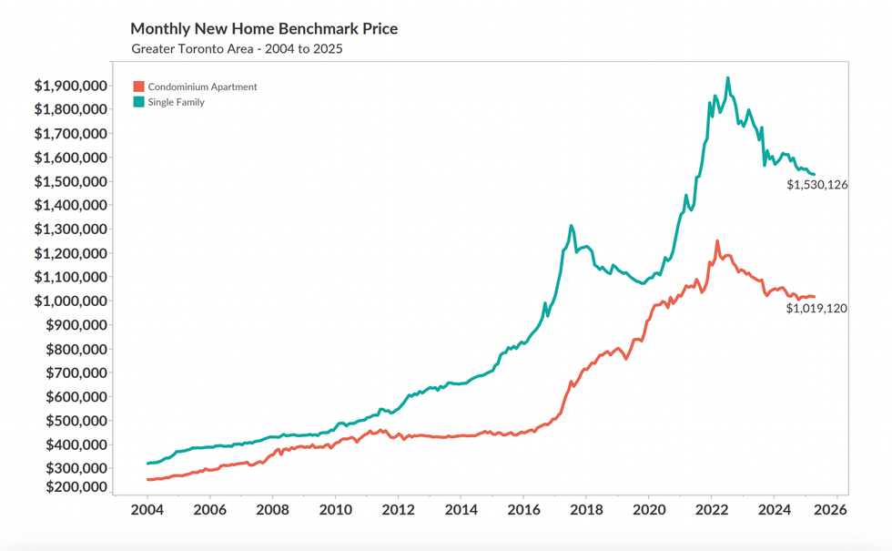On the price front, the GTA continued to see new home values fall in April with benchmark prices for both single-family homes and condos falling year over year. Condo prices have fallen 3.6% over the last 12 months to $1,019,120 and slid from $1,020,864 in March, while single-family homes fell 5.4% since last April to $1,530,126 and dipped from $1,532,279 in March.