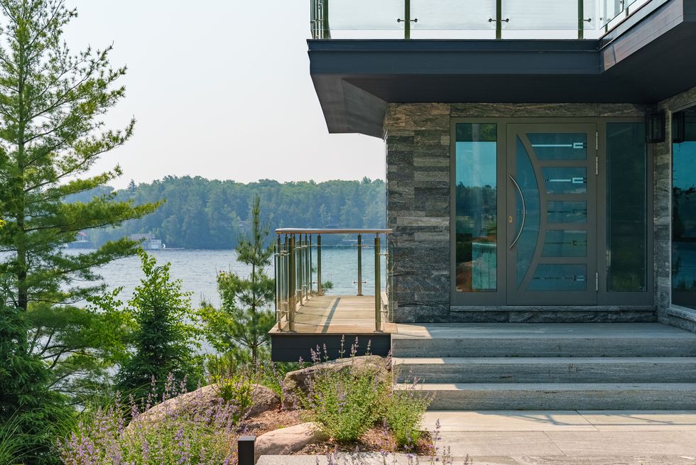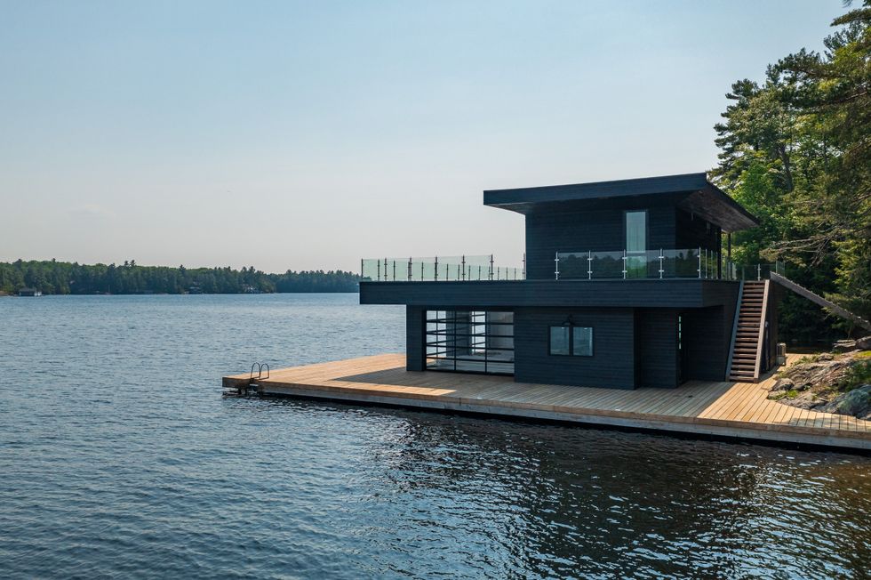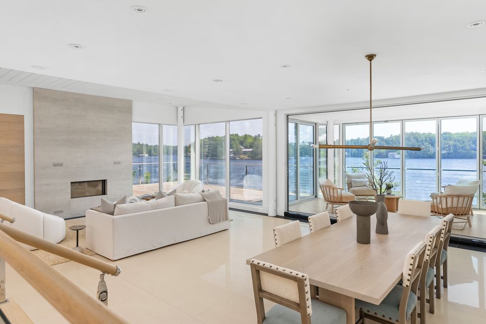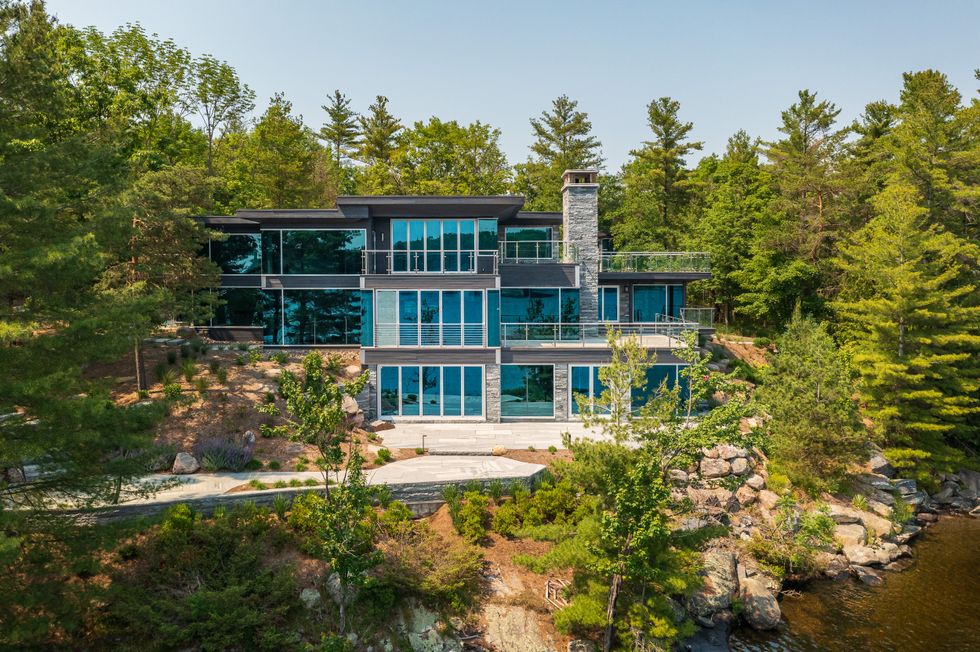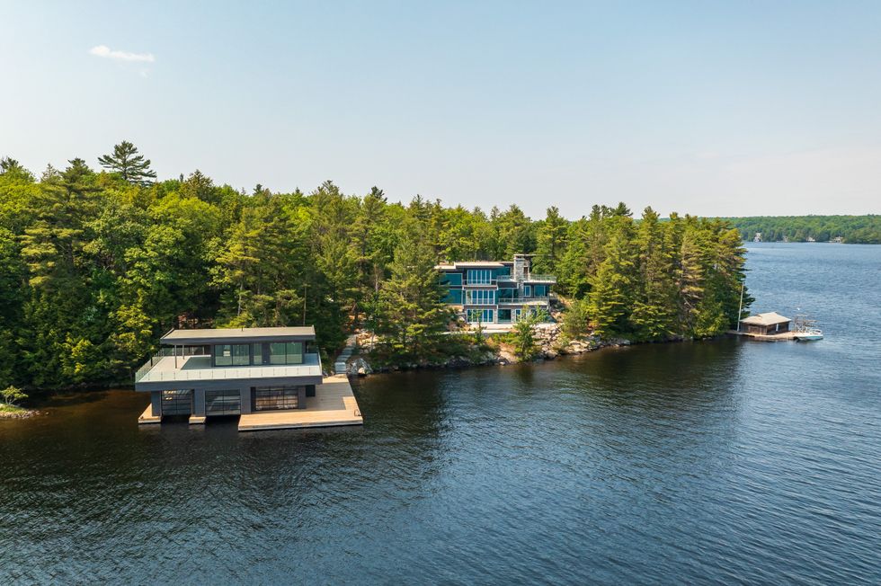 Once you've touched down on the helipad, you're invited to meander through the professionally landscaped property to arrive at the island's main event: a three-storey cottage featuring stunning contemporary designs (both inside and out) and expansive floor-to-ceiling windows that afford residents unobstructed lake vistas.