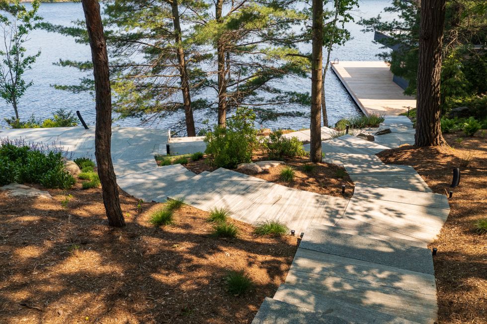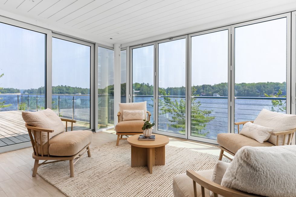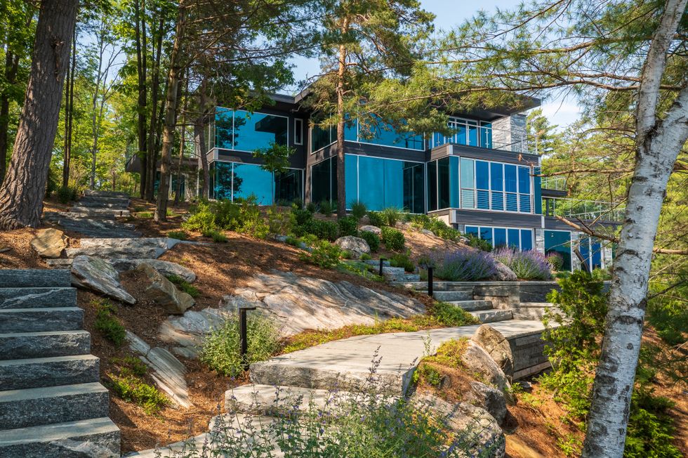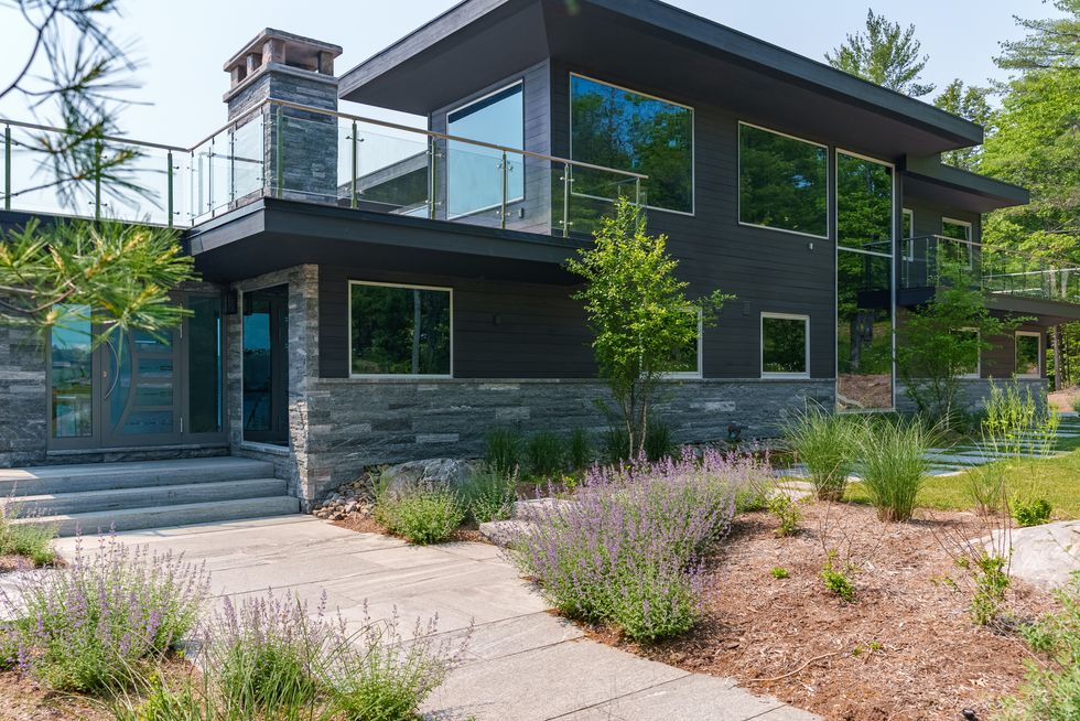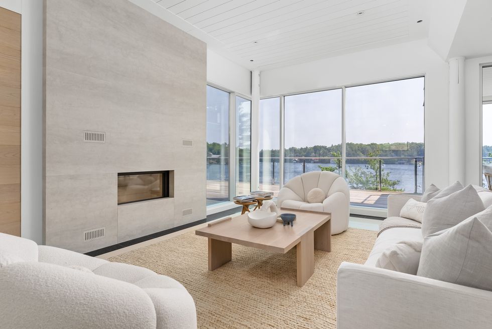 Once you've touched down on the helipad, you're invited to meander through the professionally landscaped property to arrive at the island's main event: a three-storey cottage featuring stunning contemporary designs (both inside and out) and expansive floor-to-ceiling windows that afford residents unobstructed lake vistas.