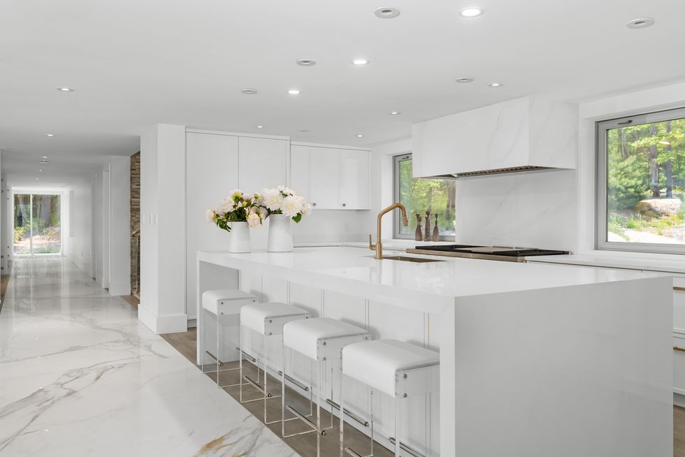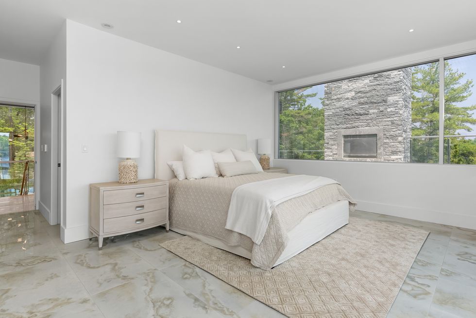 Sharing the open-concept space, a dazzling kitchen overlooks the living area, boasting high-end appliances and marble galore. And while each of those aforementioned bedrooms is retreat-like in its own right, the primary — with a spa-like ensuite and direct lake views — is particularly swoon-worthy.