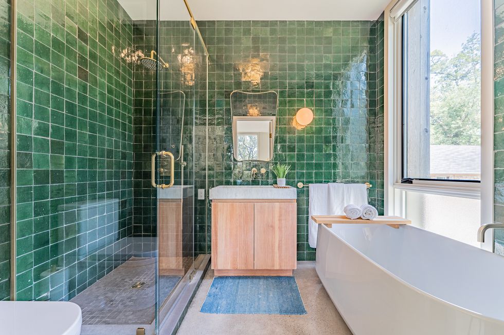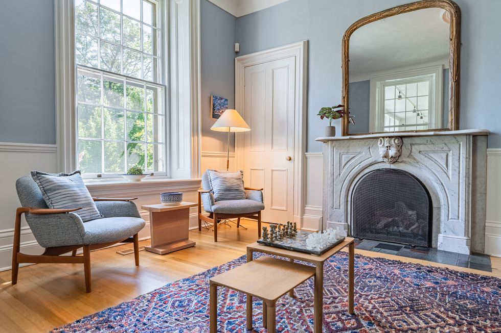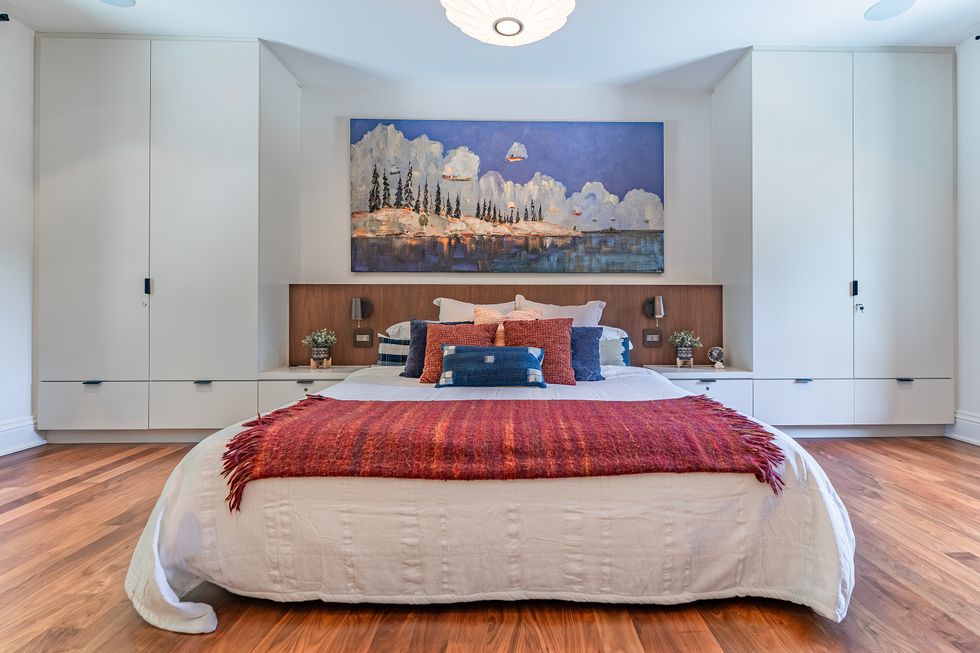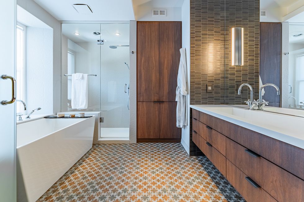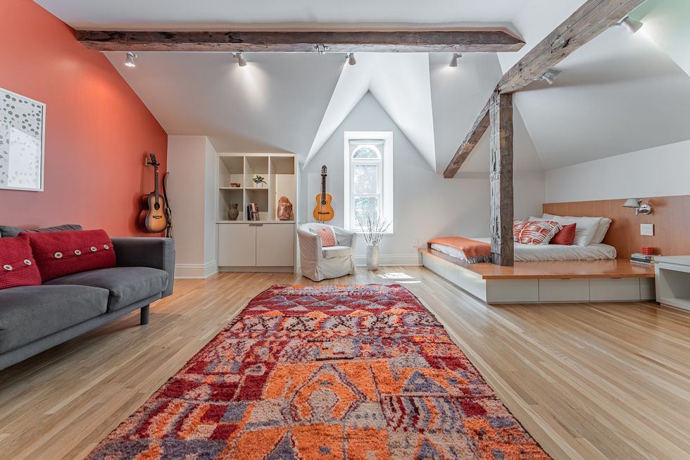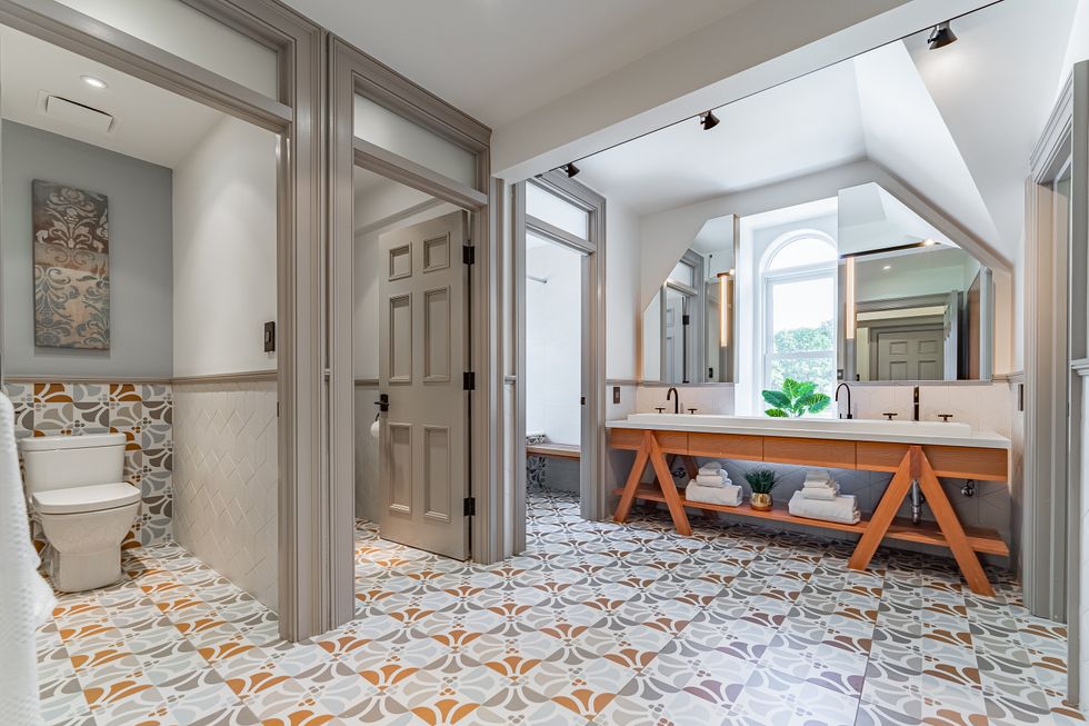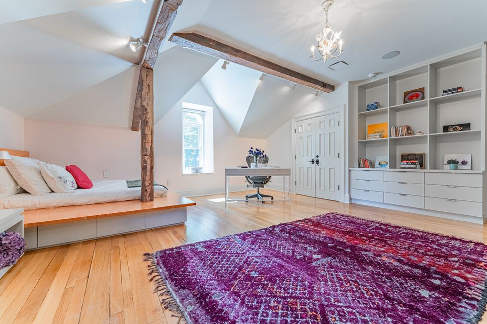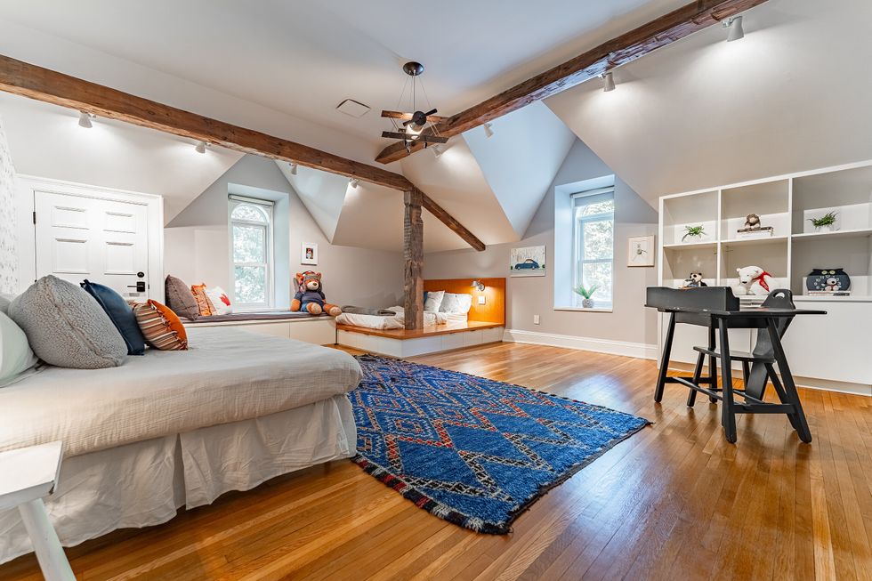 Upstairs, the primary suite and other bedrooms have been upgraded with modern finishes, but like the main floor, also retain hints of the home's origins. The primary suite itself is spacious and enjoys a spa-like ensuite with a soaker tub, standing shower, and striking wood cabinetry.