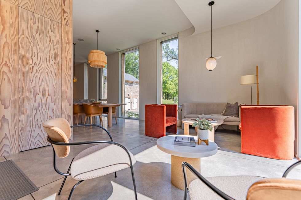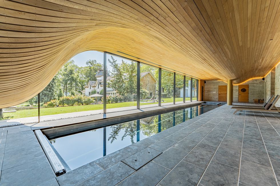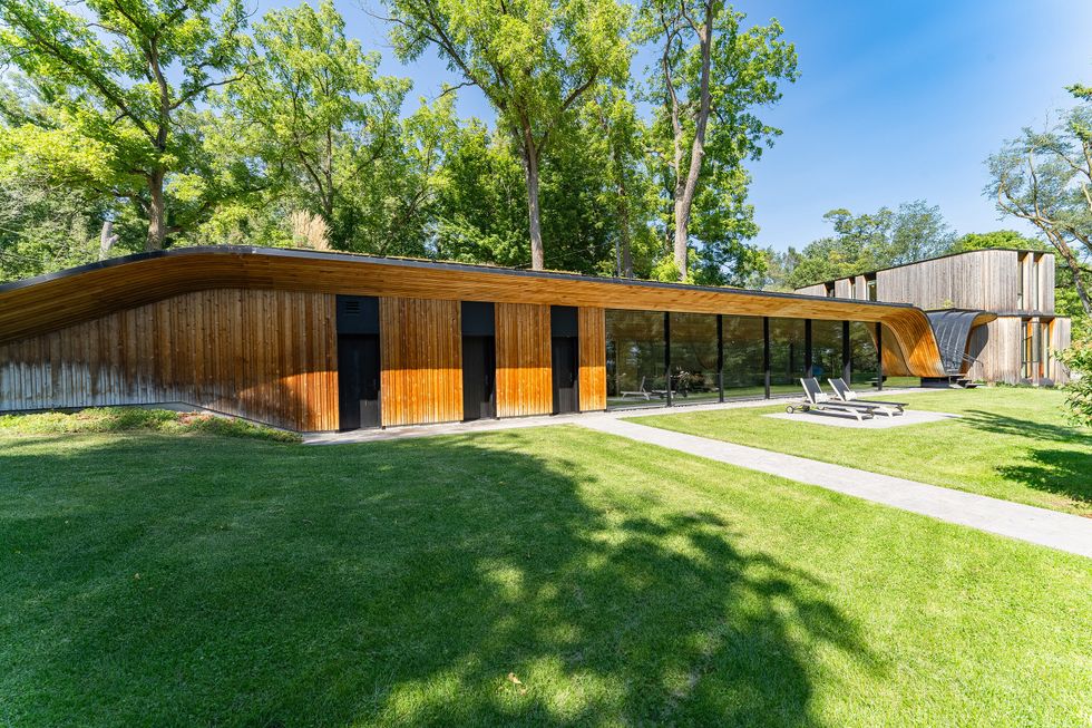 The spa building itself is an architectural marvel, featuring a sculpture-like design with curving wood forms built into the earth. Inside, an in-ground pool, hot tub, and sauna await, and an attached guest residence provides the ultimate stay for guests.