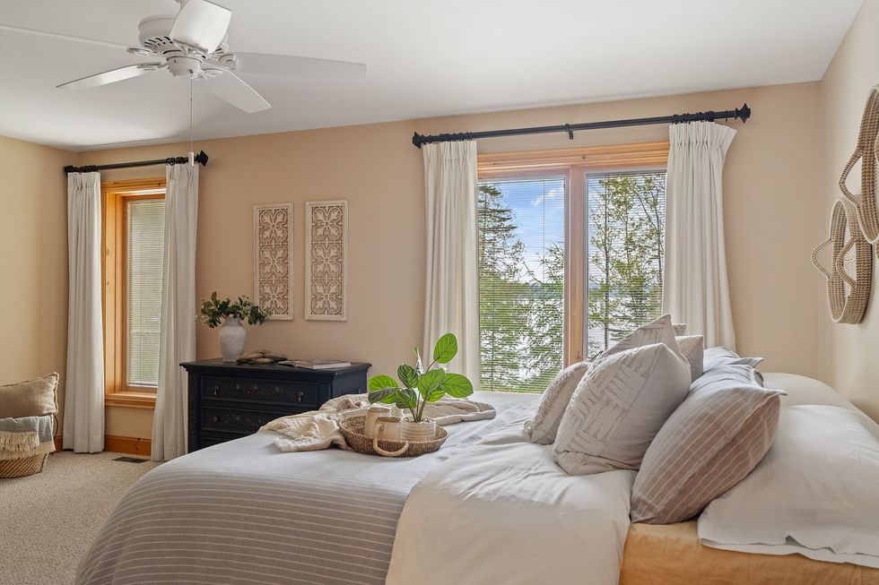 The estate boasts 250 feet of hard-packed sandy shoreline, providing breathtaking panoramic views over the pristine waters of 10 Mile Bay.