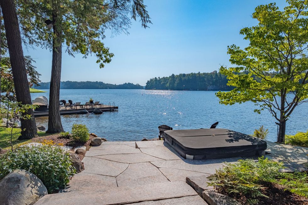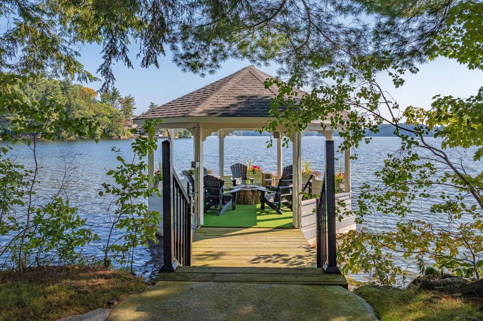 Accessible via the winding Halls Road in the township of Muskoka Lakes, the estate unfolds like a private resort. At the water’s edge, a gazebo overlooks glassy vistas, while a sprawling sun deck and stone patios invite slow mornings and golden-hour cocktails.
