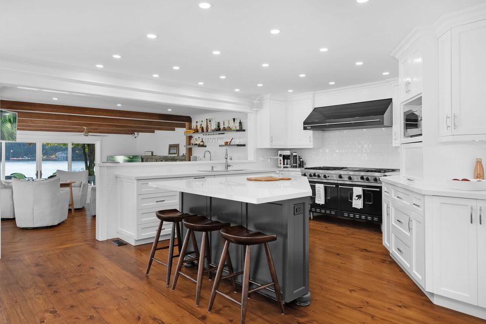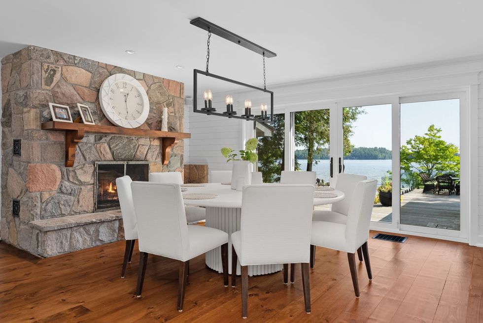 Set just steps from the shoreline — thanks to a rare, grandfathered setback — the home has been fully reimagined as a bright, open-concept retreat where natural textures meet contemporary design. The main living space is flanked by sliding glass walls, blurring the boundary between indoors and out, while two custom fireplaces — one in the dining room, another in the living room — bring warmth to every corner.