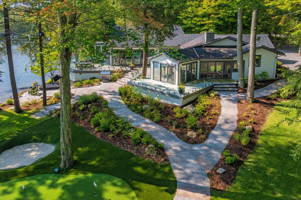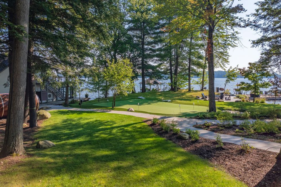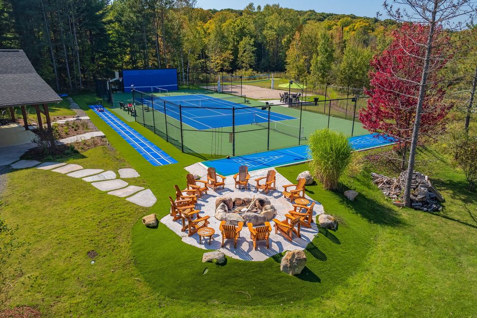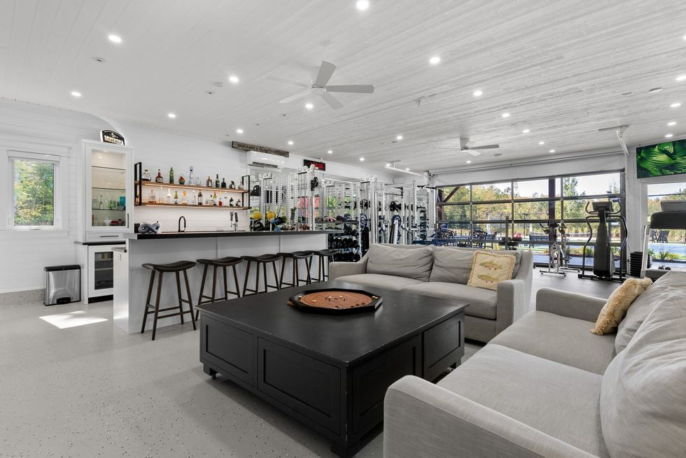 When you’re not lounging by the lake or taking in the sights from the dock, there’s still plenty to explore. A manicured putting green adds a country club flair, while a full-scale garage and sports complex ups the ante with an Olympic volleyball court, multi-sports court, and complete home gym. After a workout or friendly match, the adjoining indoor bar and seating area offers the perfect wind-down zone — or, if you prefer, you can head straight to the fire pit under the stars.