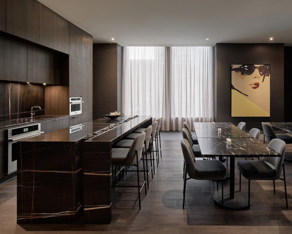In the suites themselves, residents can choose from three colour schemes — anchored by blacks, browns, or whites — all lending themselves to high-design spaces with polished marble countertops, Miele appliances, and even temperature controlled wine fridges in the kitchens and chic marble details in the bathrooms.