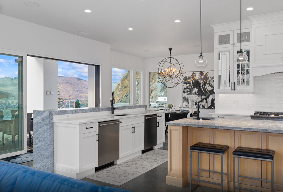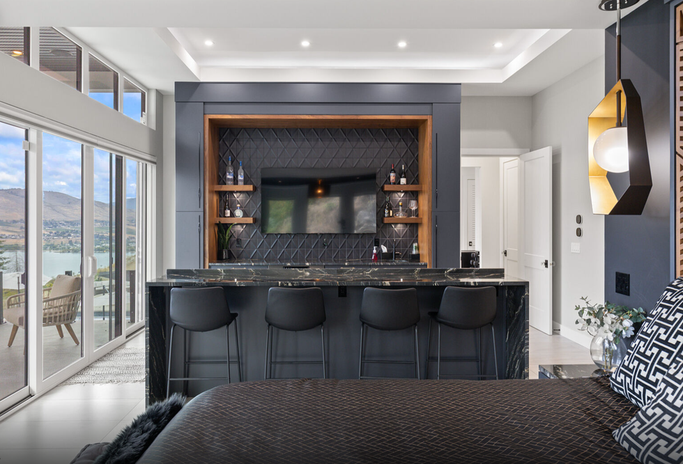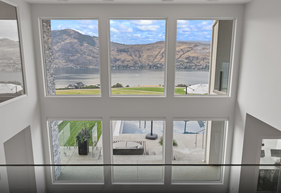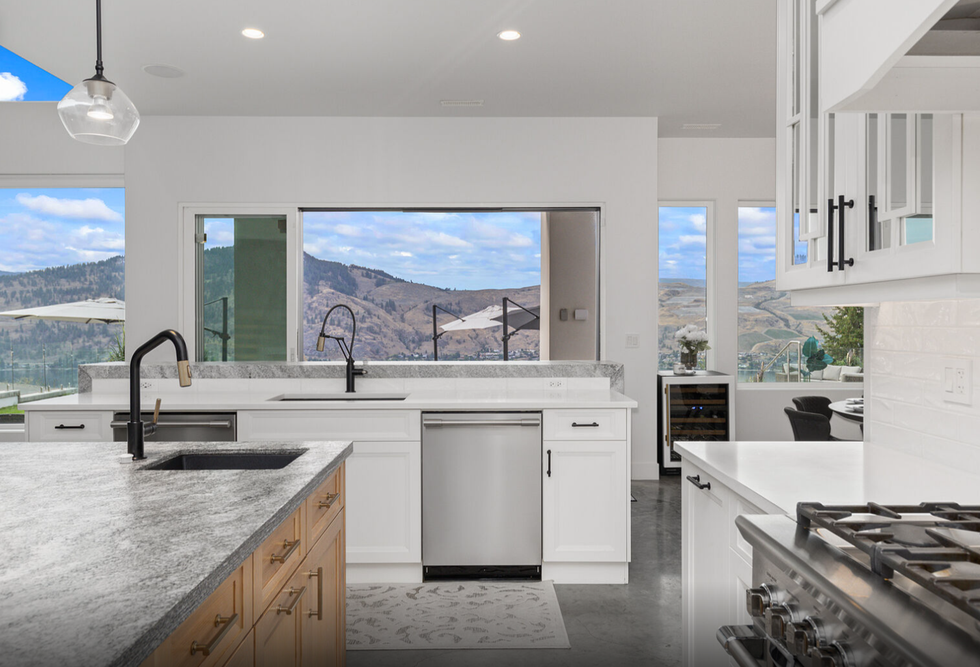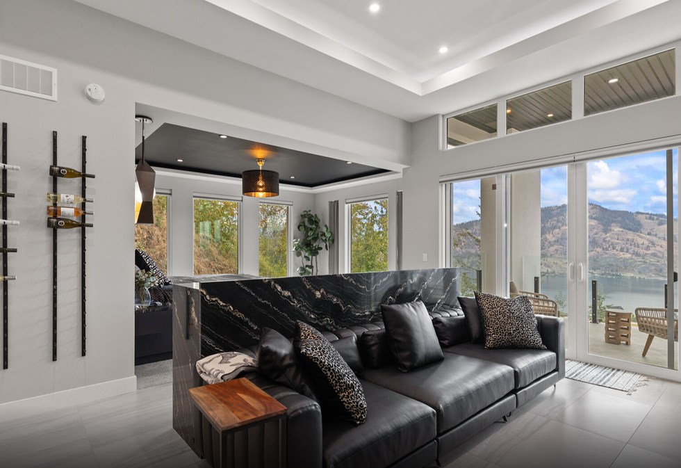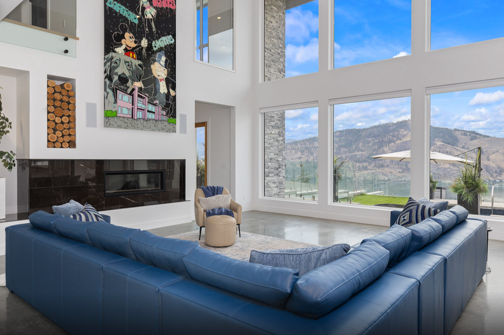 Gracefully perched atop a hill, the two-level home features a breathtaking central 23' x 25' living room, which sits below vaulted ceilings and against a set of floor-to-ceiling windows that provide panoramic views of Okanagan Lake — and beyond. Directly adjacent is an ultra-modern kitchen, equipped with a collection of high-end stainless steel appliances, marble countertops, and elegant cabinetry.