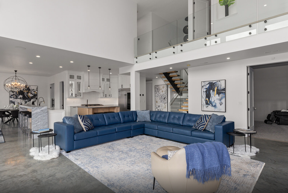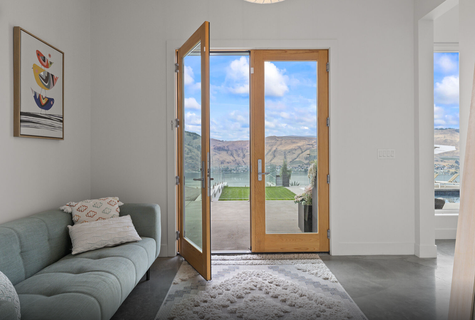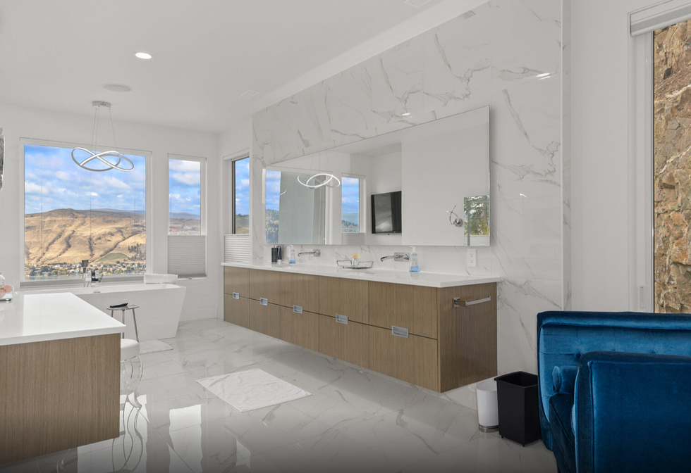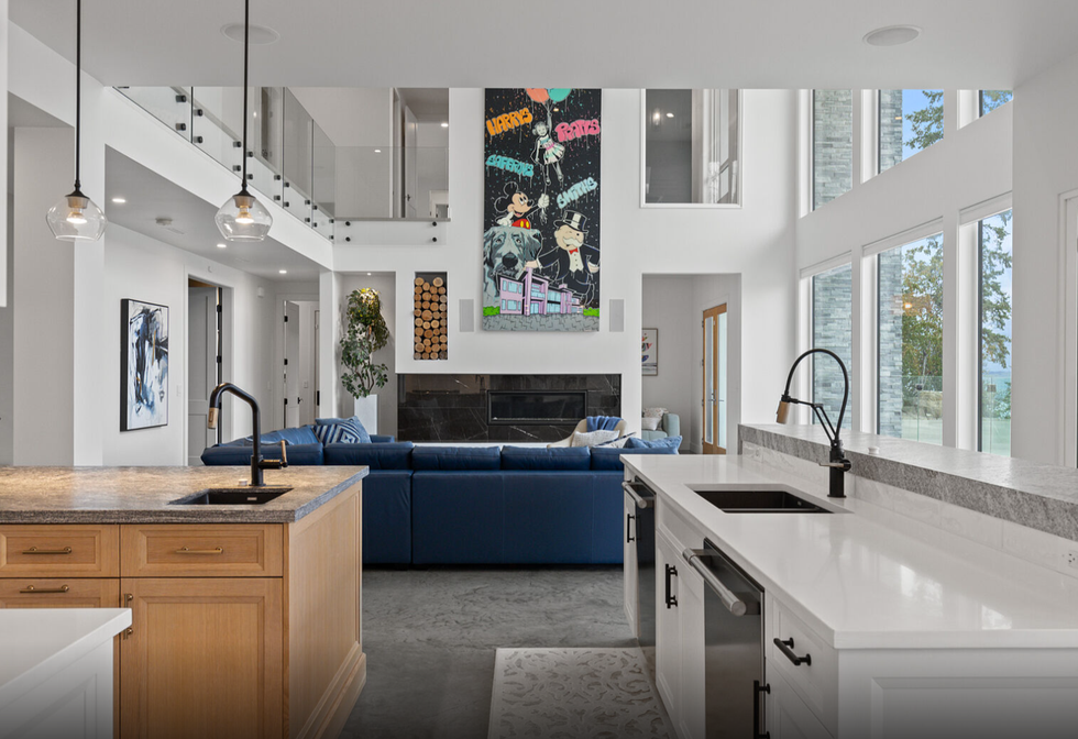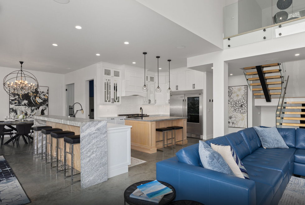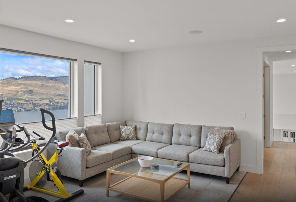 Gracefully perched atop a hill, the two-level home features a breathtaking central 23' x 25' living room, which sits below vaulted ceilings and against a set of floor-to-ceiling windows that provide panoramic views of Okanagan Lake — and beyond. Directly adjacent is an ultra-modern kitchen, equipped with a collection of high-end stainless steel appliances, marble countertops, and elegant cabinetry.