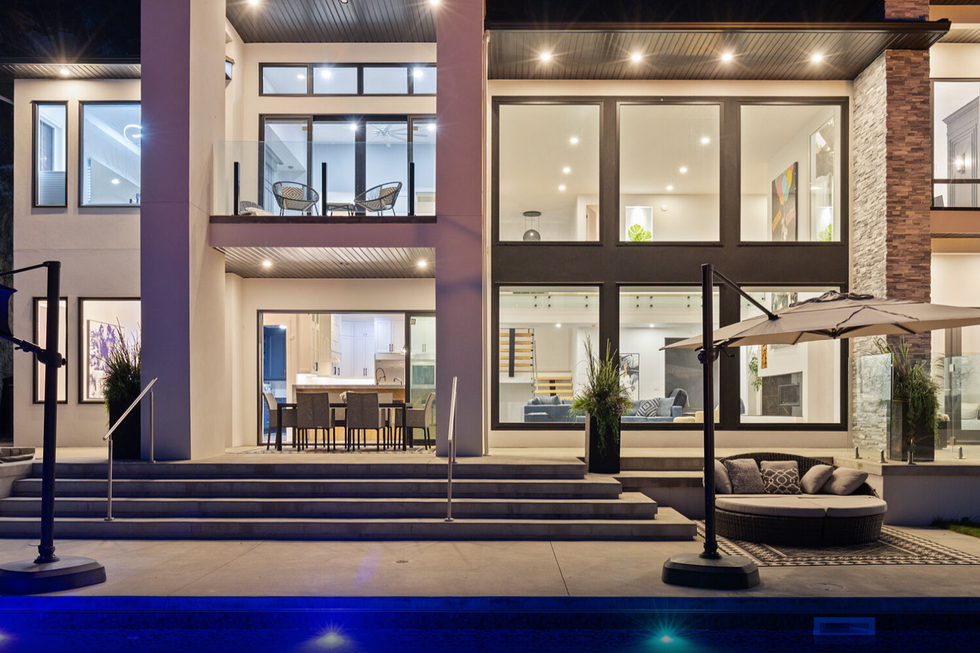 The luxury continues outside of the home with an expansive multi-level pool deck that provides multiple outdoor lounge spaces around a large pool, in addition to a hot tub, fire pit, and outdoor bathroom.
