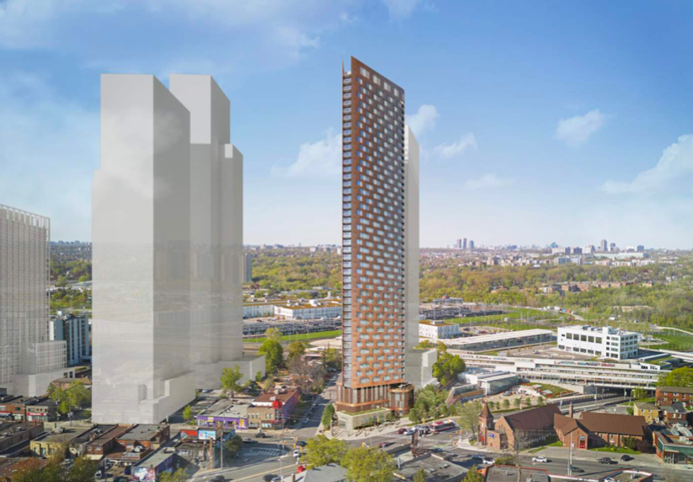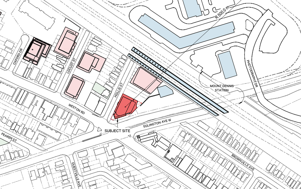 A major draw of the proposed development is the site’s situation within the Mount Dennis neighbourhood of the city, characterized as “a rapidly growing area experiencing significant intensification, driven by its proximity to the Mount Dennis Crosstown LRT Station.” (In fact, the station is around a five-minute walk from the subject site.) In addition, the Mount Dennis Protected Major Transit Station Area (PMTSA) has a “planned minimum density target of 174 people and jobs per hectare by 2031,” making a strong case for the development's approval.