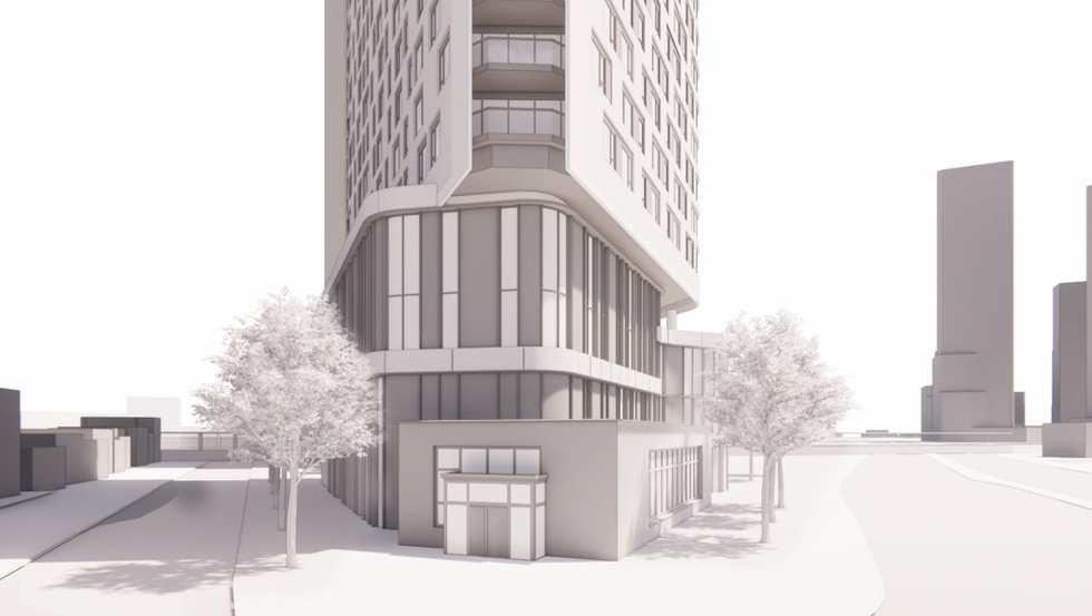The plans come from a numbered company (2629964 Ontario Inc.), and a representative from Republic Developments tells STOREYS that they are entitling the development "for now." The proposal calls for a height of around 482 feet along with 354,380 sq. feet of gross floor area (GFA), and of the total GFA, 3,390 sq. ft of commercial space is planned in the base of the building. The remainder — around 350,990 sq. ft — is set to be dedicated to the 512 residential units planned.