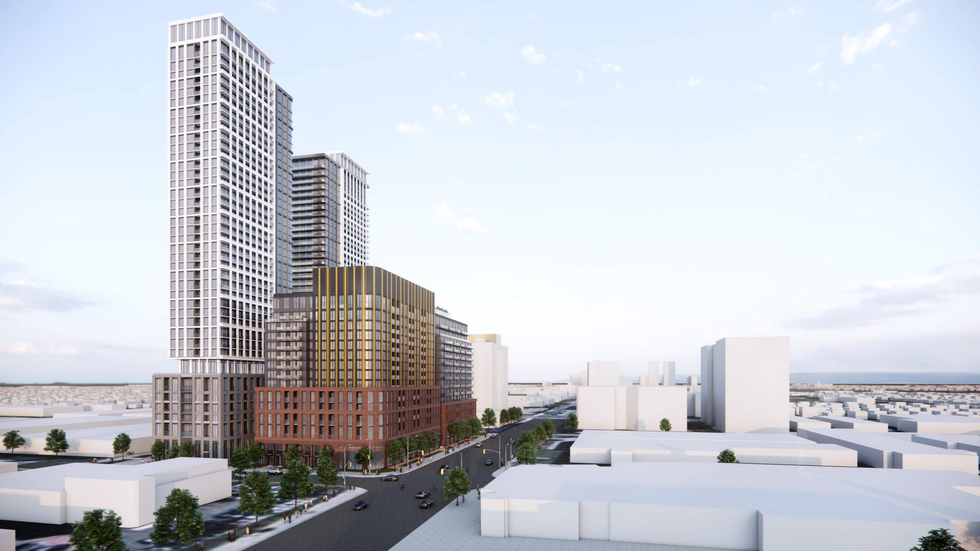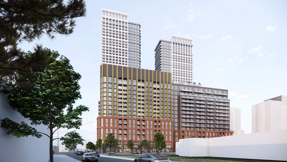 Plans for the site encompass a three-building development concept, with a 15-storey mixed-use building fronting onto Lawrence in the south, a 36-storey residential building fronting onto Lapoyan Lane in the northeast, and a 40-storey residential building fronting onto Howden Road in the northwest. Designs come from Turner Fleischer Architects and depict a dynamic built form with red brick masonry along Lawrence.