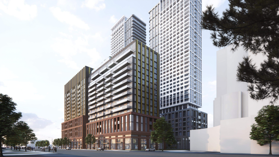 The buildings would deliver a total of 1,303 new condo units divided into 95 studio units, 764 one-bedroom units, 305 two-bedroom units, and 139 three-bedroom units. These residents would have access to 1,078 vehicular parking spaces across four levels of underground parking and 992 bicycle parking spaces located at grade and in the mezzanine.