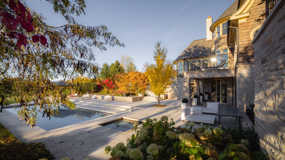 The extravagance continues outdoors, where the grounds unfold like something from a dream. An inviting pool and hot tub pairing are framed by stunning stone patios and gorgeous perennial gardens. Beyond, a large swimming pond glistens, offering a “back-to-nature” way to refresh in the heat of summer.