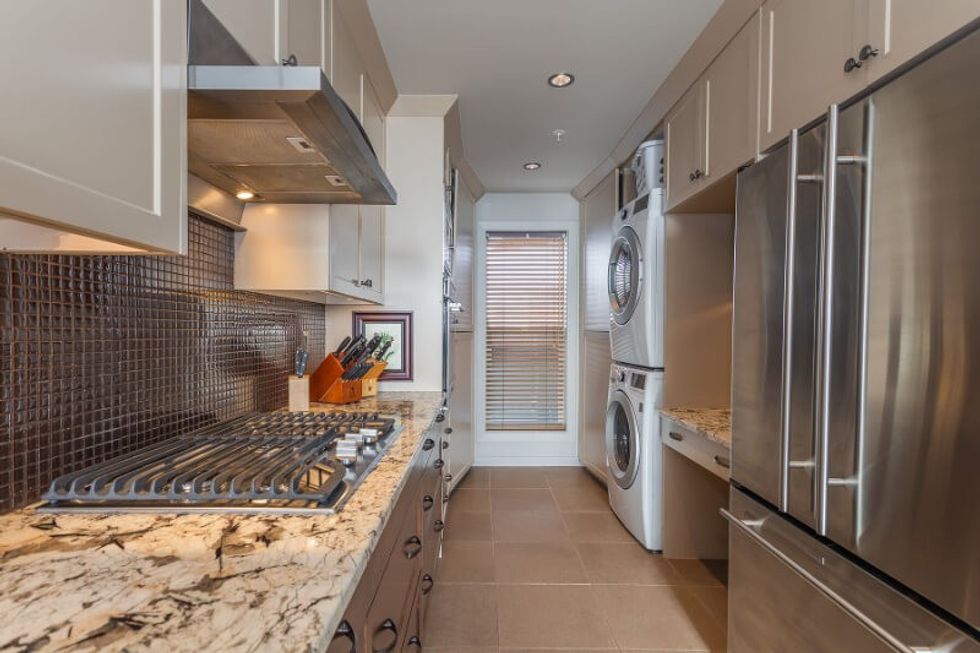 The main level of the home features a central living space and dining space beneath vaulted ceilings and a wall of windows that lead out onto the balcony, which provide truly awe-inspiring panoramic views. The kitchen sits just next to the dining space and is equipped with an array of high-performance stainless steel appliances. Elsewhere on the main level is a 16' x 1'' bedroom and 10' x 7' bathroom.