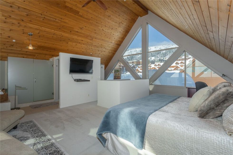 The home's 24' x 17' primary bedroom waits on the upper level of the home, boasting vaulted ceilings once more, and a luxurious 15' x 9' ensuite bathroom. The bedroom is equipped with yet another set of large windows, providing amazing views of the nearby resort community and, of course, the snowy mountains and terrain.