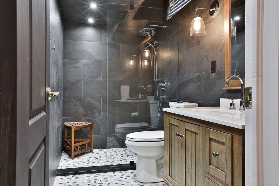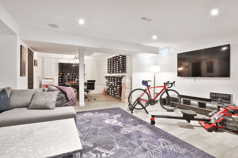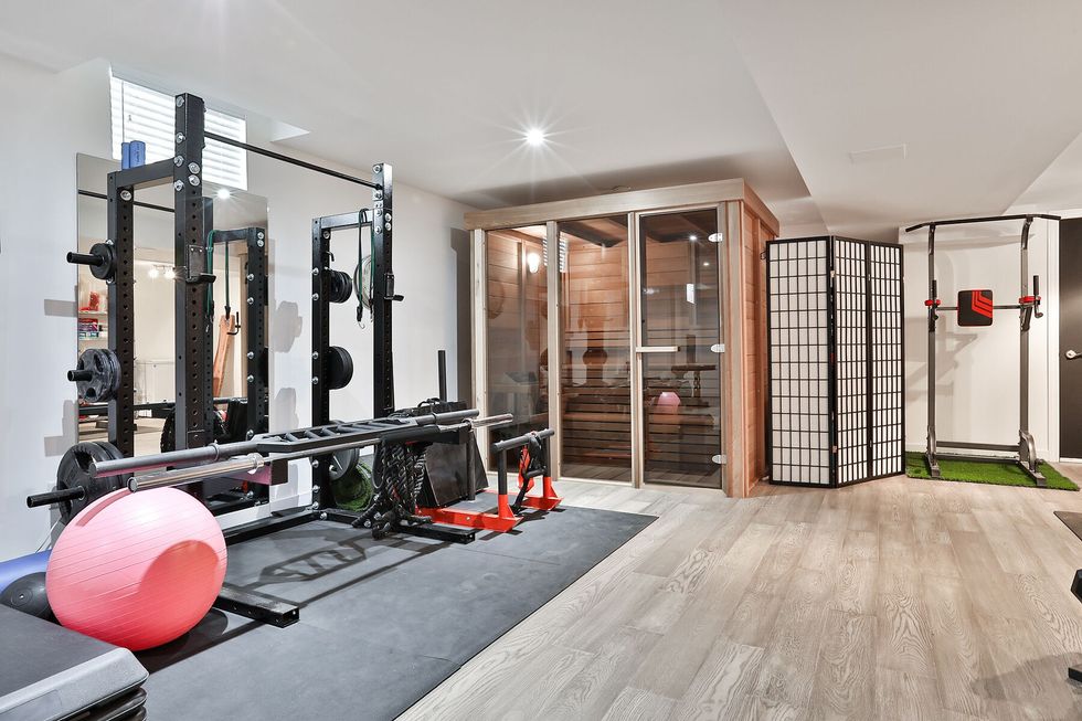 The finished lower level is tailored for wellness and recreation. Here, a fitness zone and games area meet a full bath and sauna, creating a dedicated hub for active living and relaxation alike.