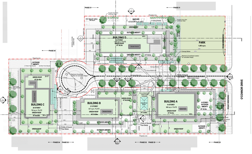 Once complete, the site would be organized with 14-storey Building A along the eastern edge of the property, fronting onto O'Connor Drive and the new public road; 21-storey Building B sitting to the west of Building A, also fronting onto the new street; 29-storey Building C located west of Building B and fronting onto a cul de sac at the end of the new road; and 15-storey Building D sitting north of the new road and directly west of the 15,769-sq.-ft public park.