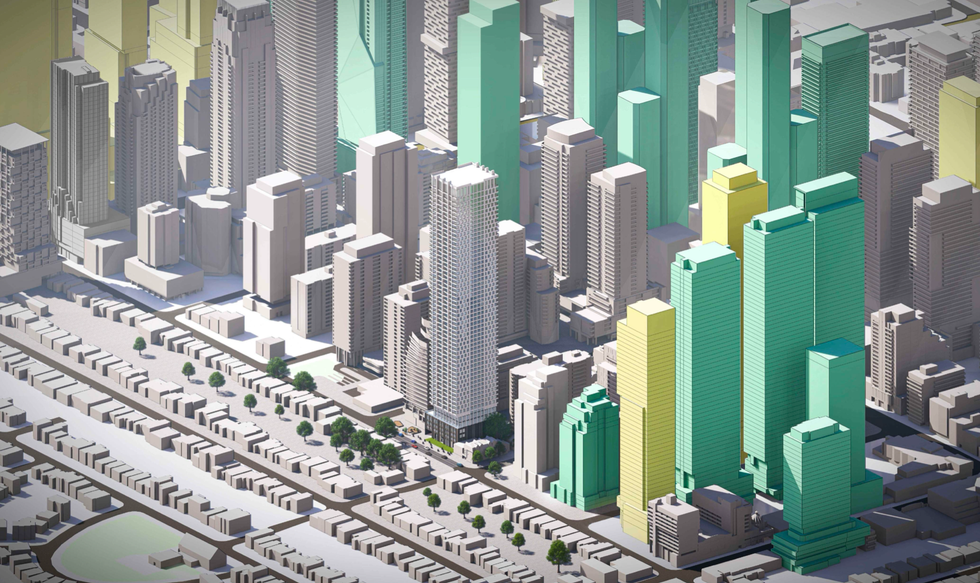 The proposed building is set to rise over 608 feet to the top of the mechanical penthouse, and include a gross floor area (GFA) of 501,027 sq. ft, all of which would be dedicated to residential. A total of 674 rental units have been proposed, including 14 rental replacement units required in accordance with the City’s rental replacement policies, 53 studios, 107 one-bedrooms, 322 one-bedroom plus dens, 112 two-bedrooms, and 66 three-bedrooms.