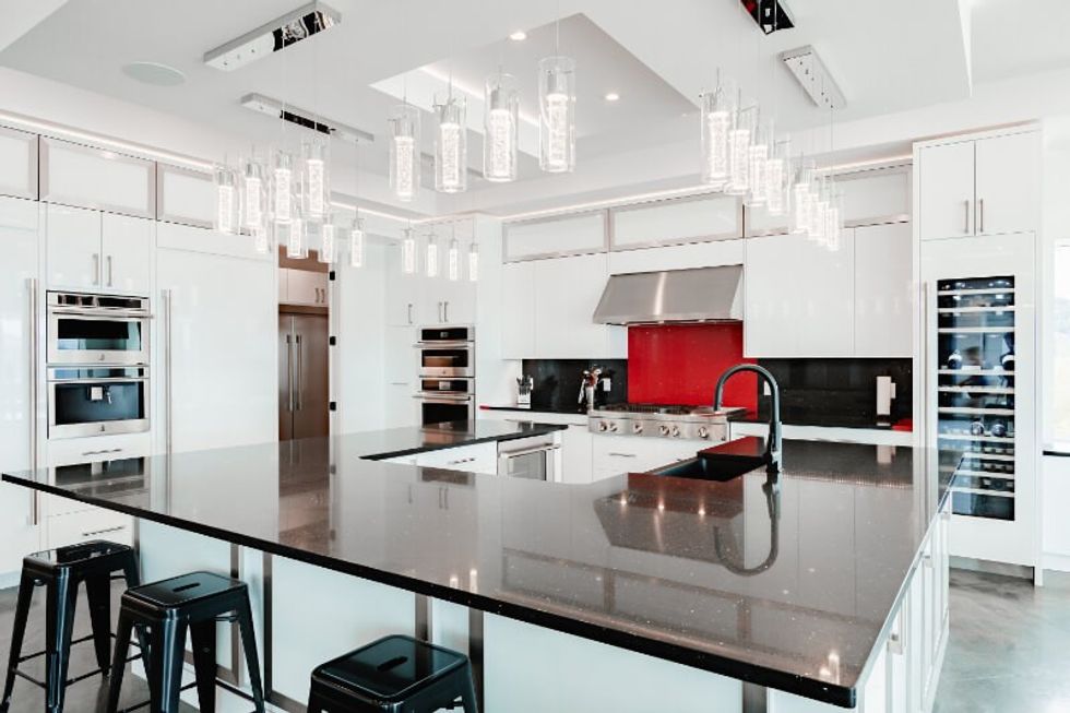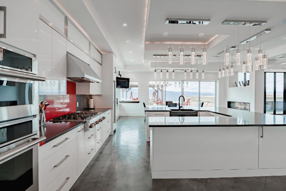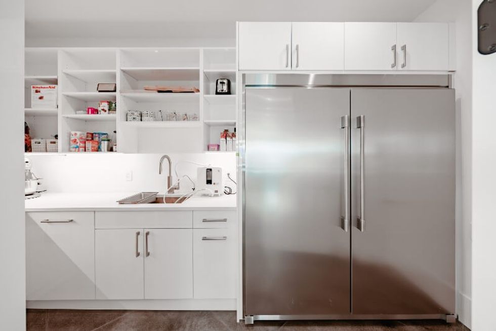 Even amid all the opulence on display at this property, the stunning kitchen is a standout. This central hub features a huge U-shaped island, a collection of high-performance built-in appliances, minimalistic cabinetry, and elegant lighting fixtures above. A walk-in pantry and built-in wine fridge are cherries on top of the perfectly curated space.