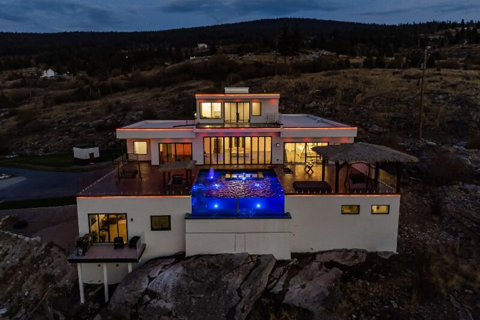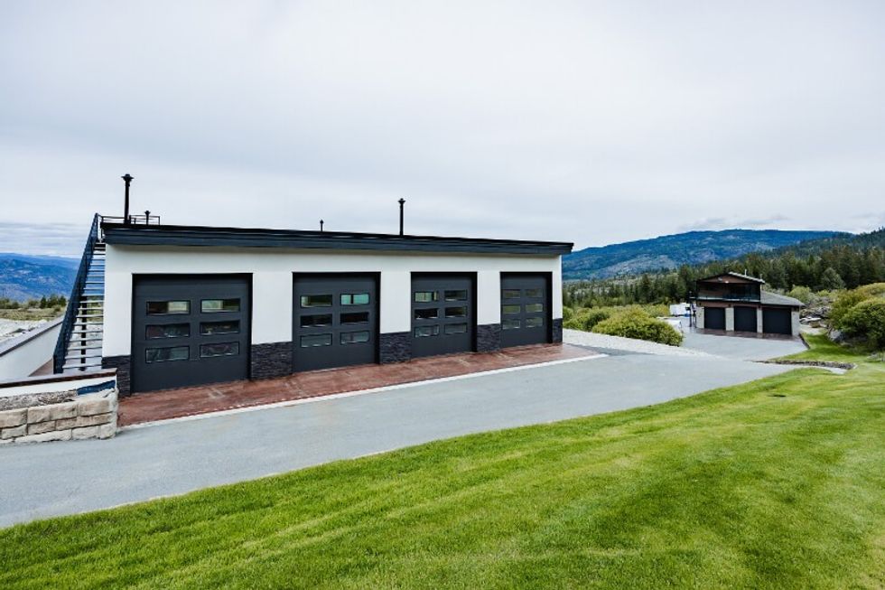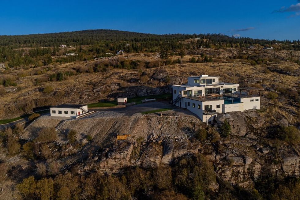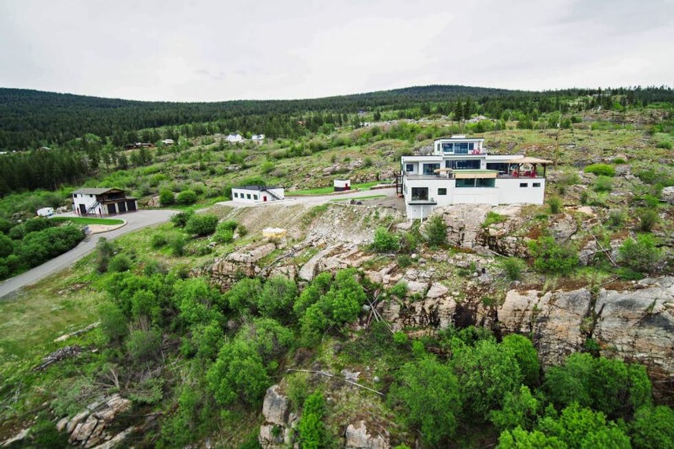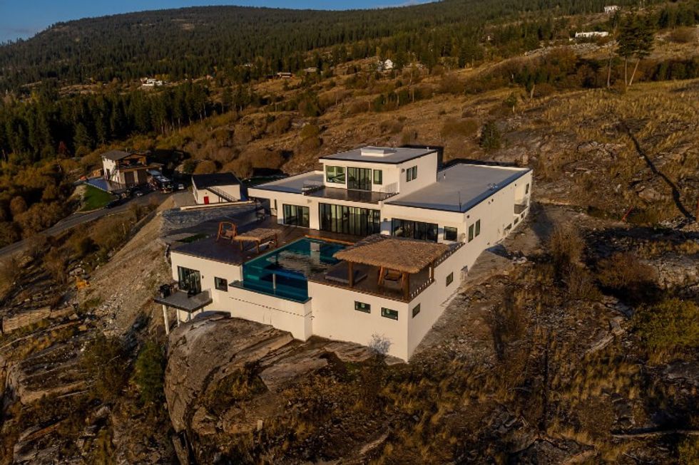 The white, angular, compound-esque home was originally constructed in 2021 and includes five bedrooms, four bathrooms, and 5,233 sq. ft of modern living space, all across a sprawling 13.14 acres. The address is perched above a small cliff, overlooking the surrounding landscape, and serves scenic views of Penticton and Lake Okanagan.