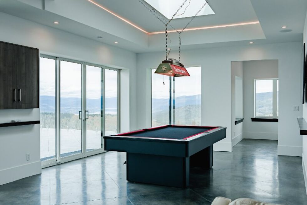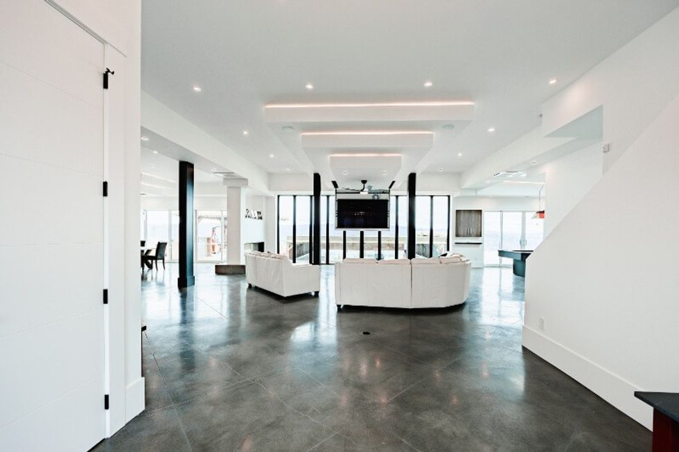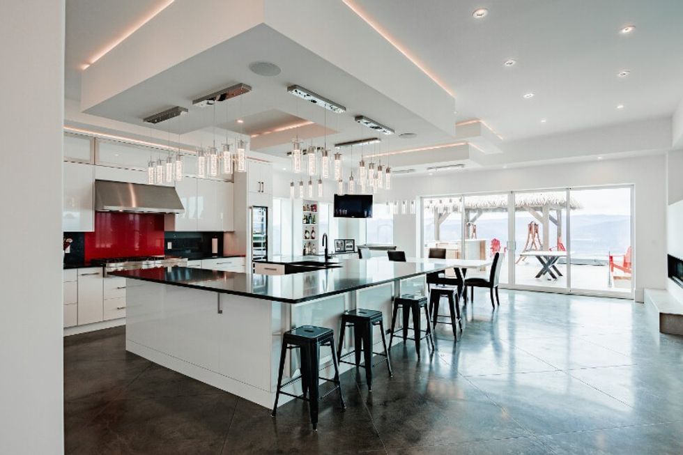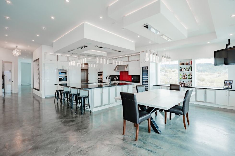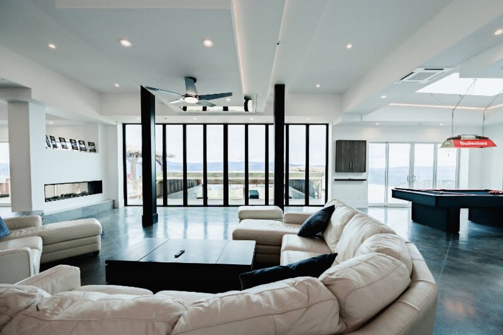 The white, angular, compound-esque home was originally constructed in 2021 and includes five bedrooms, four bathrooms, and 5,233 sq. ft of modern living space, all across a sprawling 13.14 acres. The address is perched above a small cliff, overlooking the surrounding landscape, and serves scenic views of Penticton and Lake Okanagan.