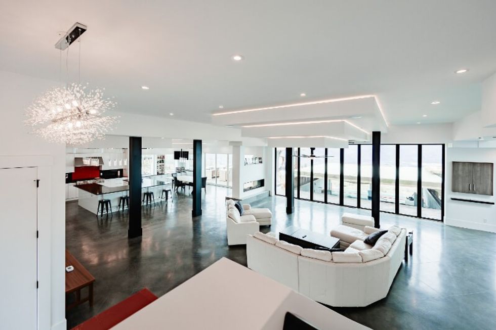 The home's central living space is beautifully lit, and spans a large living room, dining room, and kitchen, all laid out in a modern open floorplan. A built-in, double-sided fireplace anchors the area. The living room sits against a set of floor-to-ceiling windows that stretch from wall to wall, while the dining space is set against another set of windows that provide direct access to the patio outside.