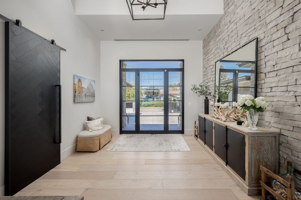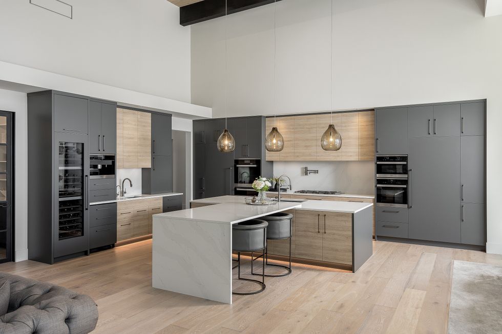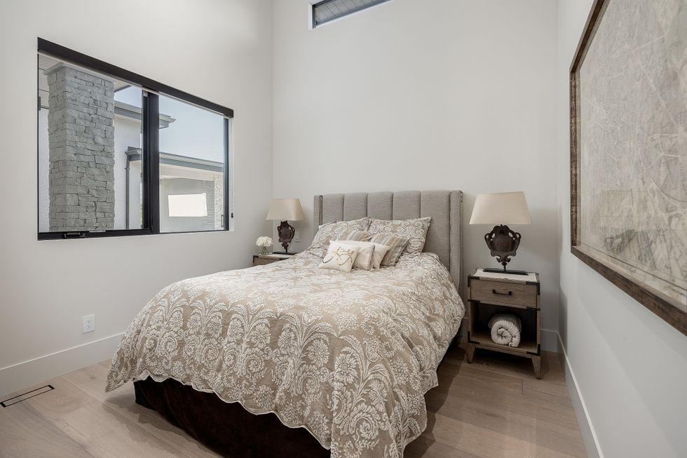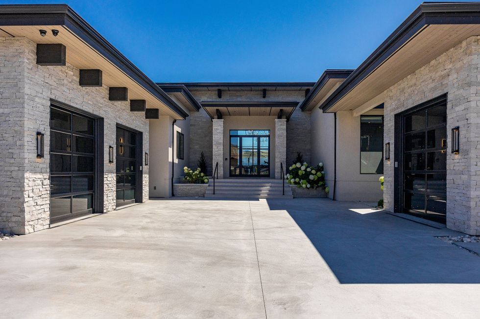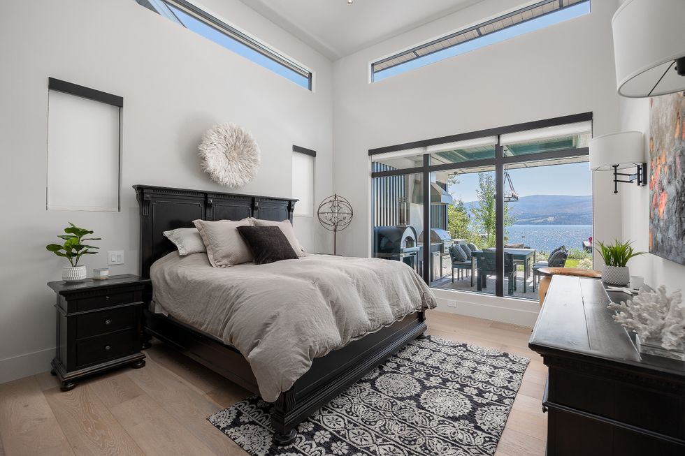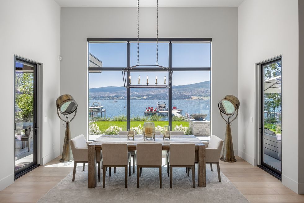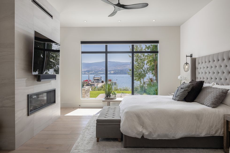 At the heart of the home is a lake-facing chef’s kitchen, where sleek Miele appliances, sophisticated metal accents, and oversized windows allow the outdoors to become part of the daily routine. A spacious walk-in pantry just off the kitchen doubles as a potential wine room — a fitting detail, given the home's enviable position in one of Canada’s most celebrated wine regions.