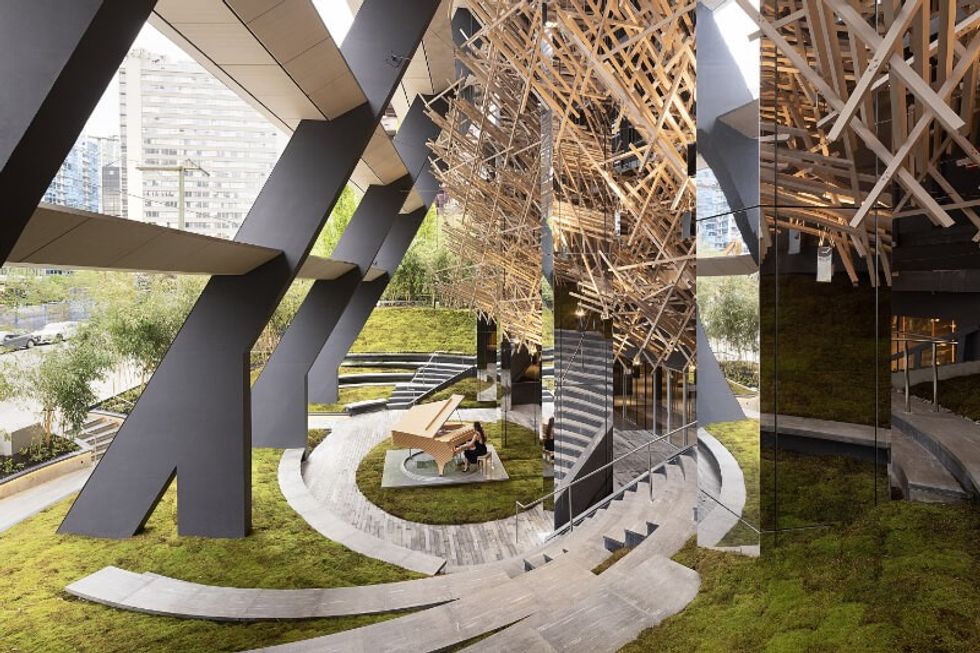 Designed by Japanese architect Kengo Kuma, the 43-storey Alberni tower — located at 1568 Alberni Street in the West End of Vancouver — is defined by emphatic scoops, carvings, deep balconies, and a strong relationship with the streets — and incredible views — that sprawl out below.
