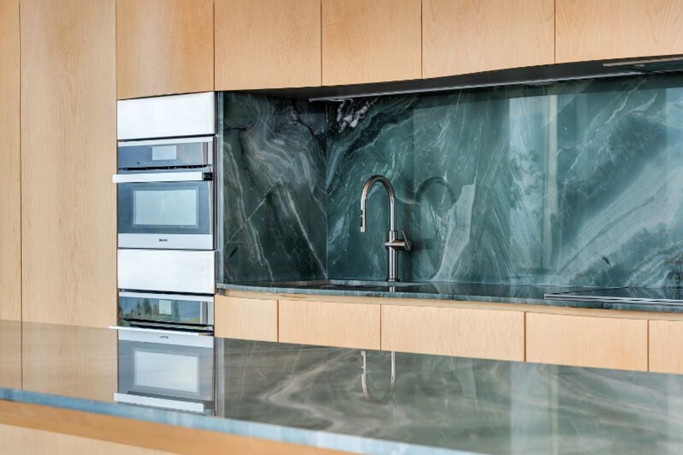 The kitchen is a stand-out. The central island, which features Brazilian "Laguna Bay" quartzite countertops, is designed like a table with space underneath, as opposed to a traditional island with cabinety. The rest of the kitchen, featuring wooden cabinetry, makes use of a unique and chic wavy design.