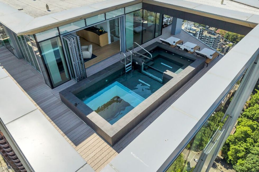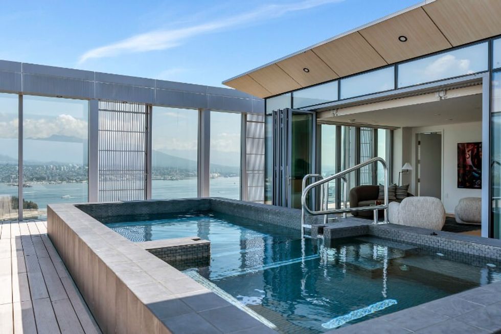 On the top level of the home — and the top of the building, at that — is the recreational room, a flex room, and the home's main attraction: a 1,396-sq. ft of outdoor terrace centred around a stunning hot tub and pool, which is designed with a glass bottom that looks down onto the two lower floors. The terrace provides an abundance of lounge space and 270 degrees of views. The home, in other words, is a true marvel.