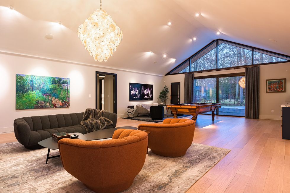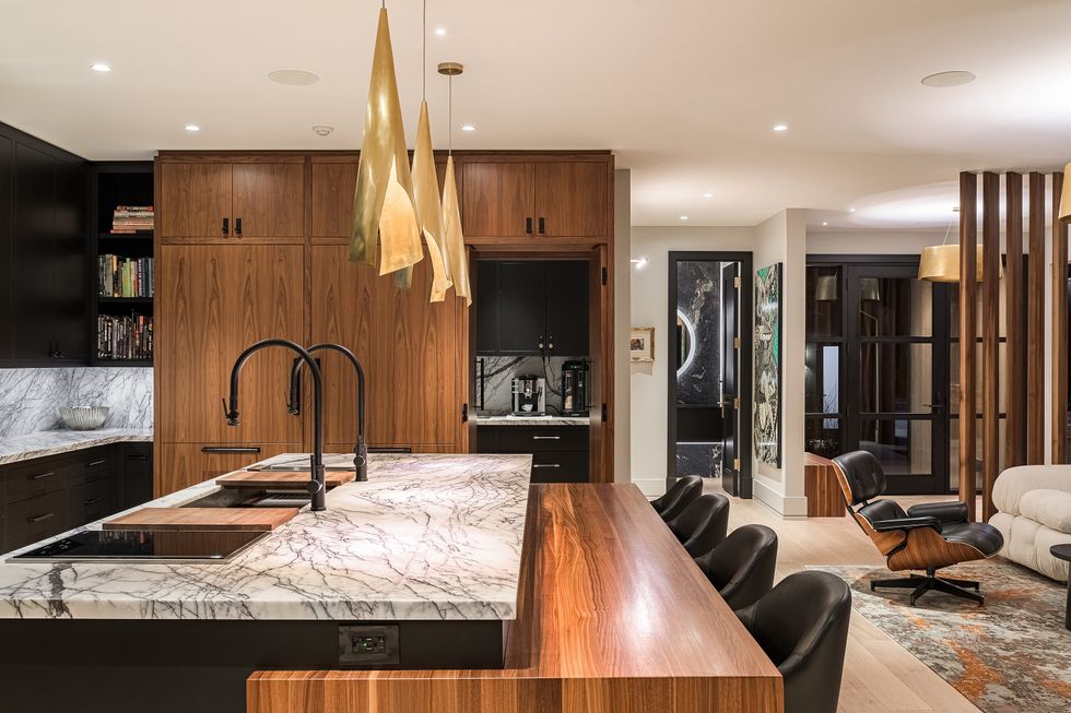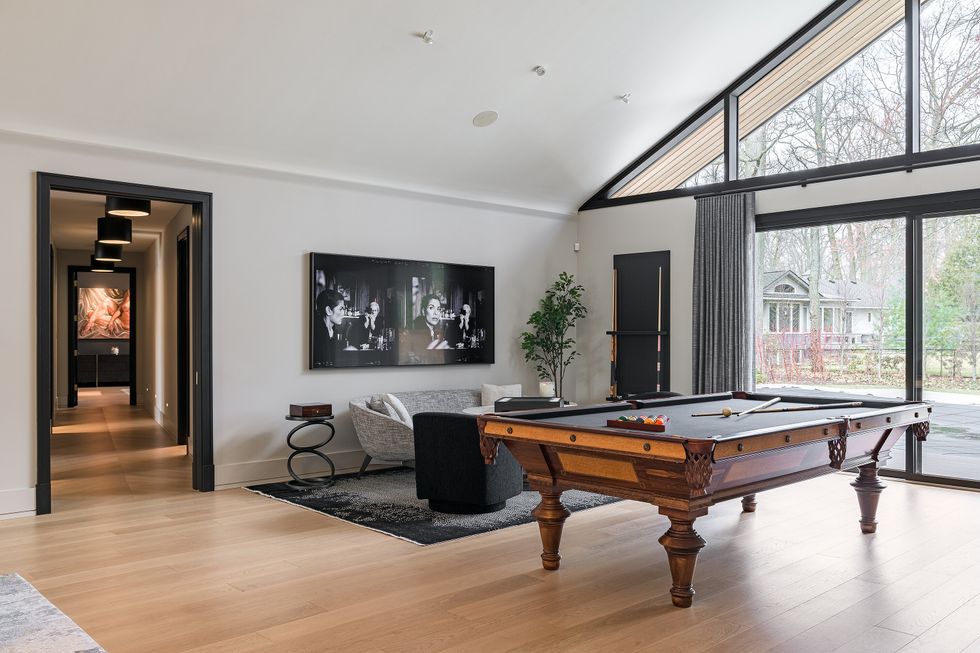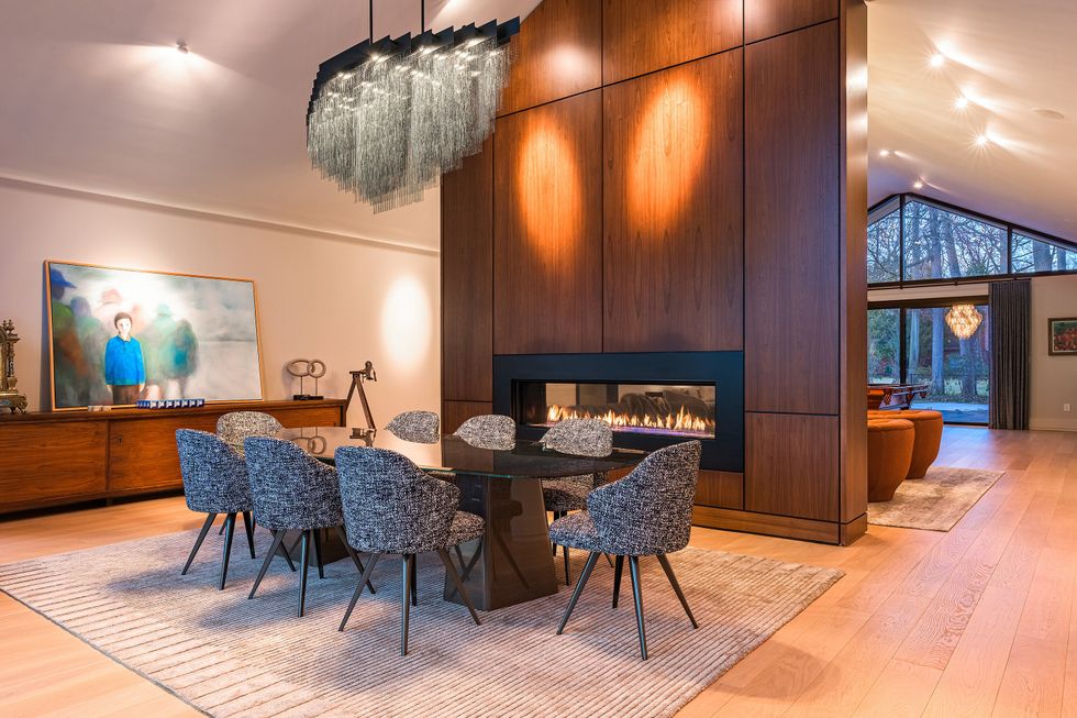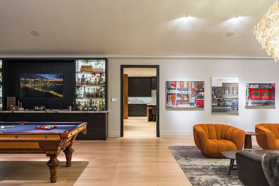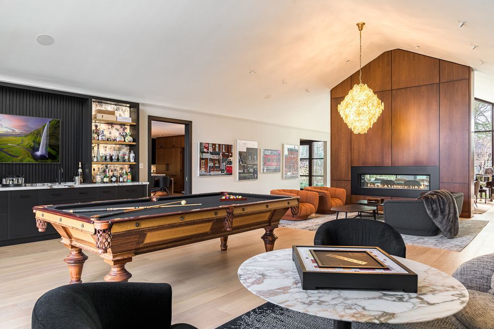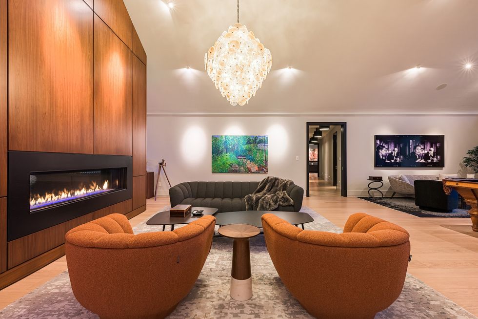 Light-filled and modern, the home's entryway leads through to a spacious dining, living, and games-room area, complete with a wet bar and a floor-to-ceiling, two-sided fireplace. Ideal for chef-types, the gourmet kitchen comes complete with top-of-the-line appliances, a spacious island with waterfall countertops, and ample storage solutions.