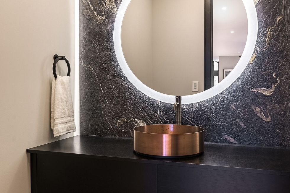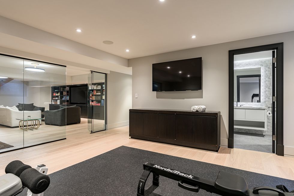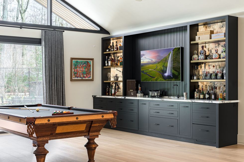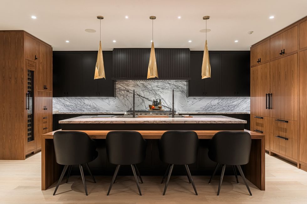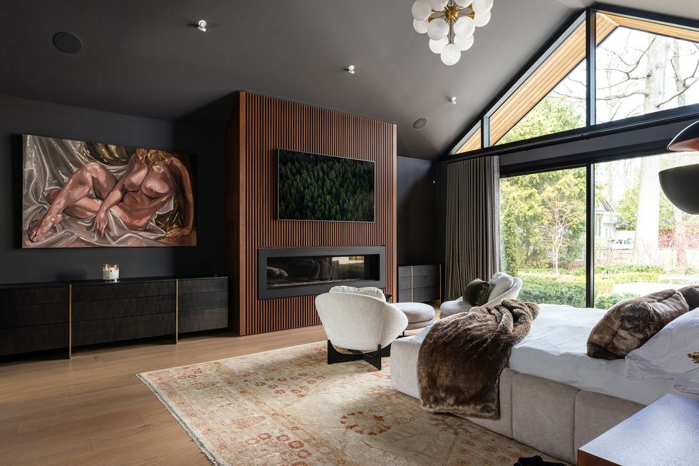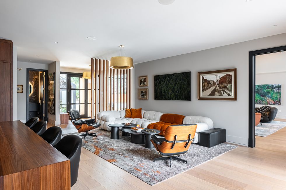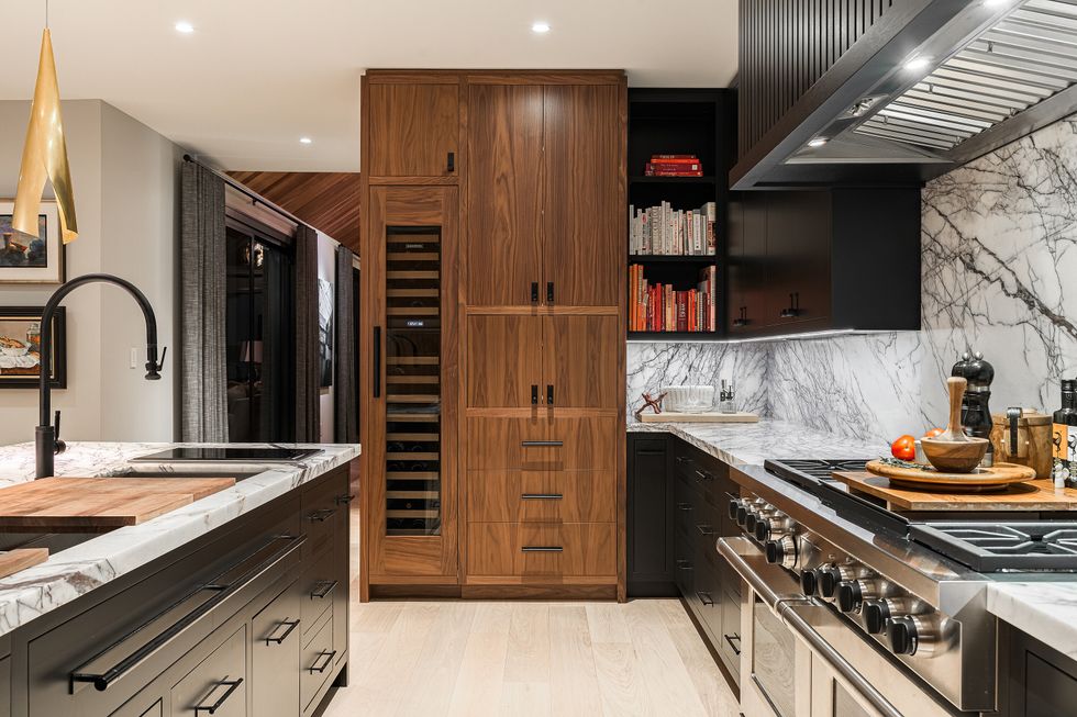 Light-filled and modern, the home's entryway leads through to a spacious dining, living, and games-room area, complete with a wet bar and a floor-to-ceiling, two-sided fireplace. Ideal for chef-types, the gourmet kitchen comes complete with top-of-the-line appliances, a spacious island with waterfall countertops, and ample storage solutions.