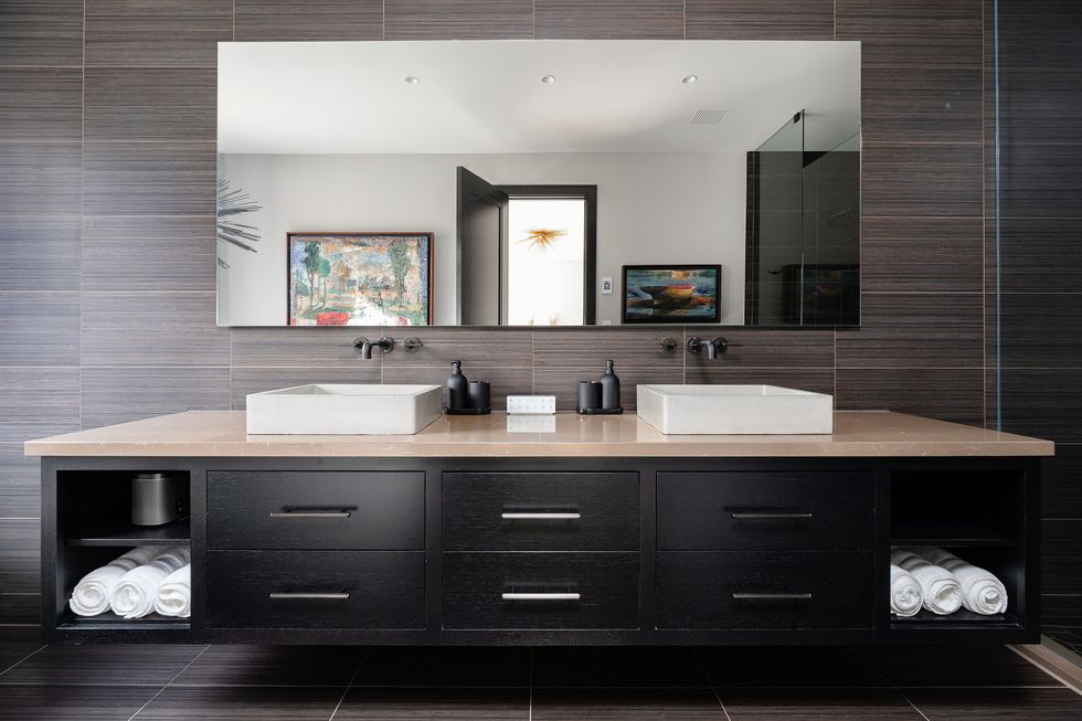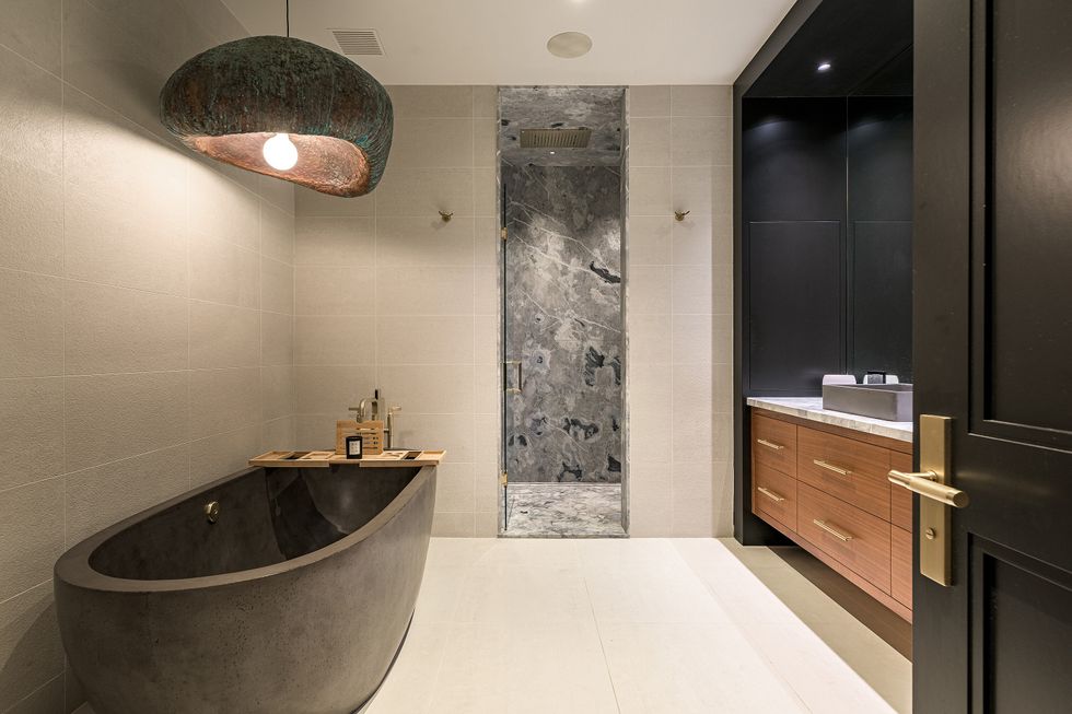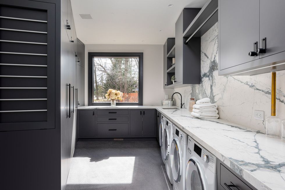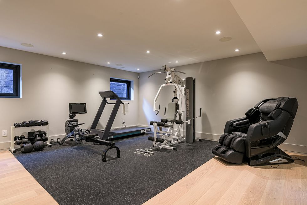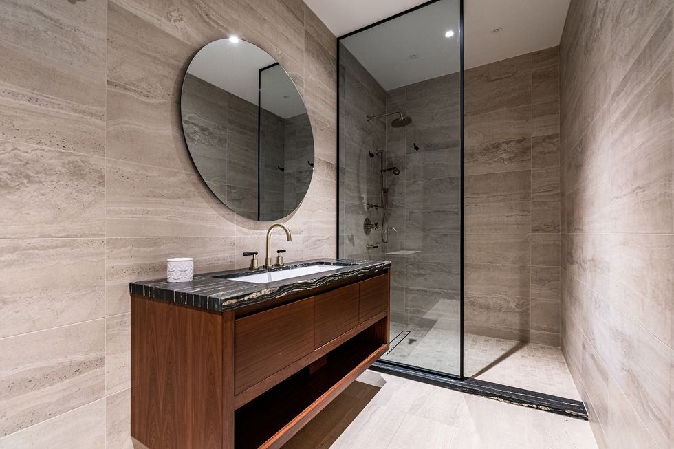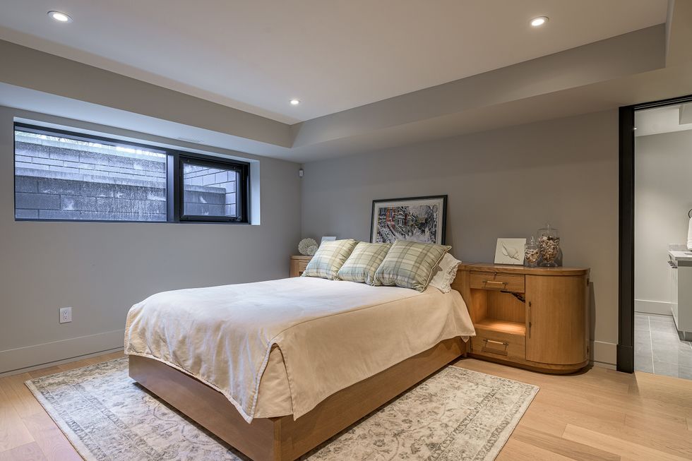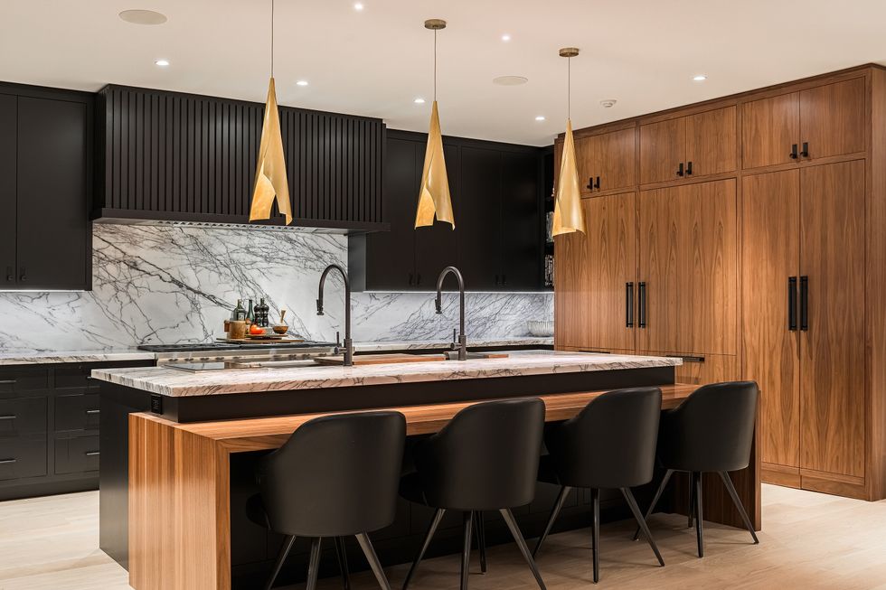 Light-filled and modern, the home's entryway leads through to a spacious dining, living, and games-room area, complete with a wet bar and a floor-to-ceiling, two-sided fireplace. Ideal for chef-types, the gourmet kitchen comes complete with top-of-the-line appliances, a spacious island with waterfall countertops, and ample storage solutions.