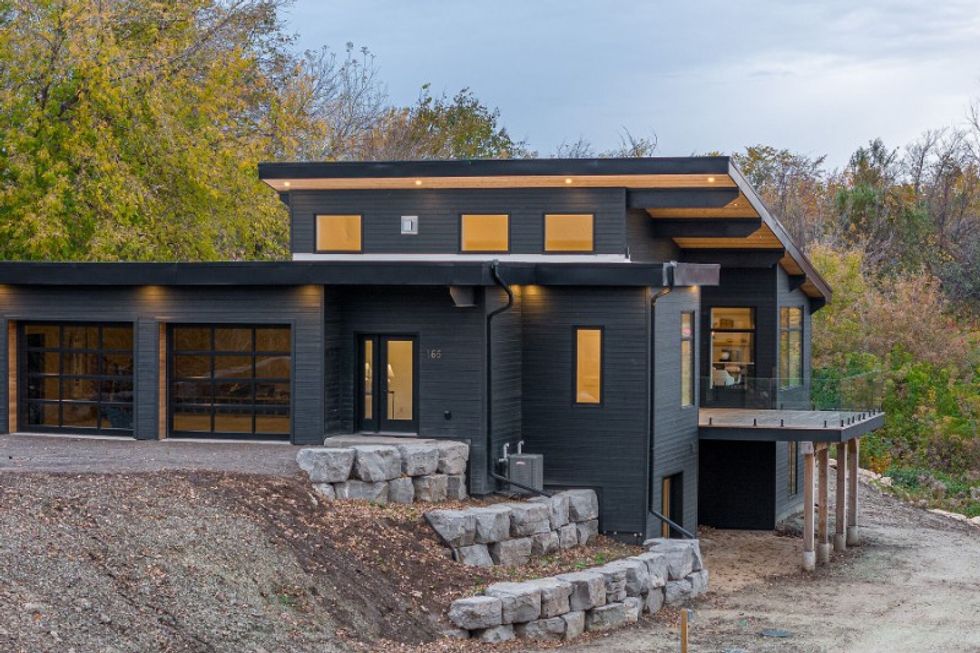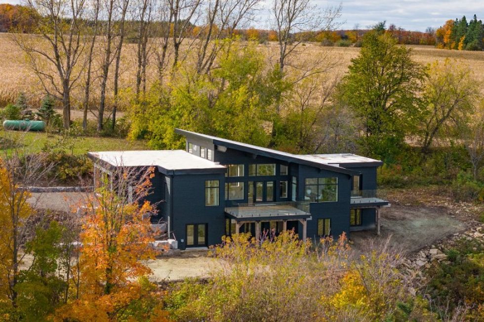 The sleek slate grey and angular shapes of the exterior make for a striking juxtaposition against the rolling hills and lush forests that surround the home. Stepping inside, you’re greeted with a warm yet modern space — high ceilings, rich hardwood floors, and clean lines abound.