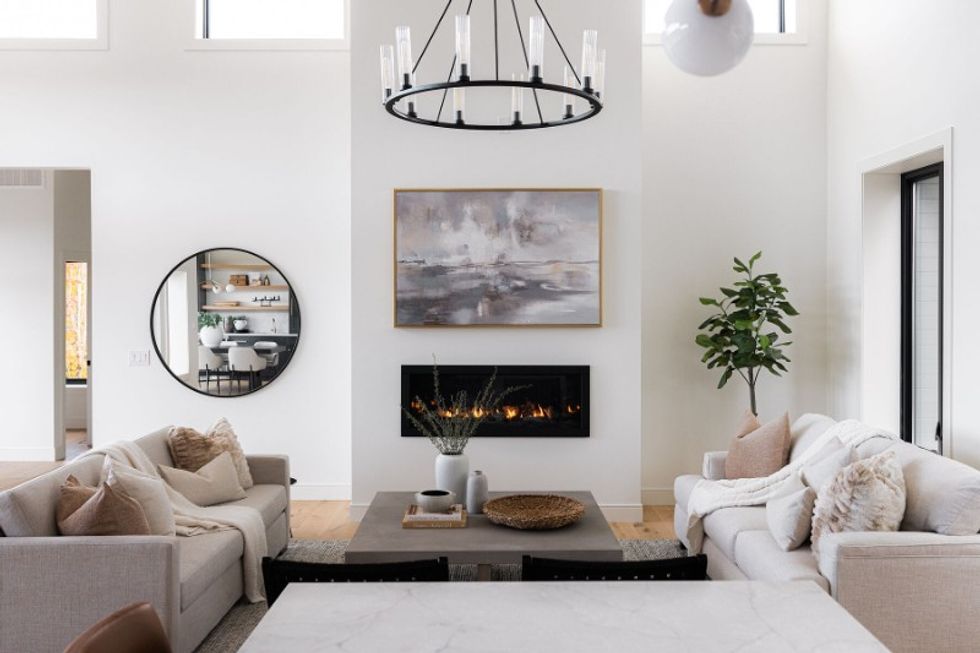 Thanks to the open-concept layout, the living area, with its cozy fireplace, blends seamlessly into the gourmet kitchen, which includes built-in top-of-the-line appliances, a farmer’s sink, and a butler’s pantry. Gold hardware and custom millwork make for opulent touches.