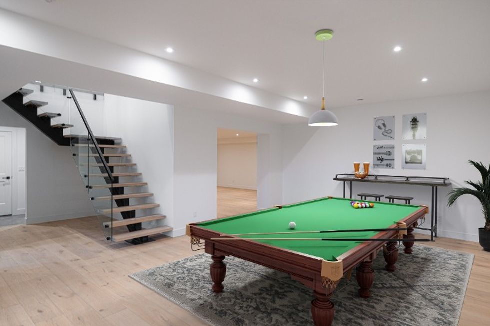 Down the custom floating staircase, radiant in-floor heating and nine-foot ceilings make for a cozy and spacious lower level. In addition to the remaining three bedrooms, there’s space for a home office, theatre, and games room. The oversized two-car garage covers all storage needs.