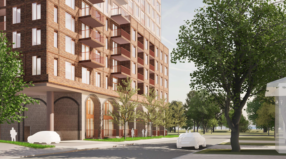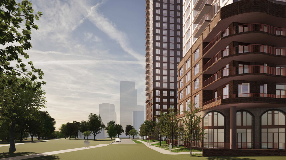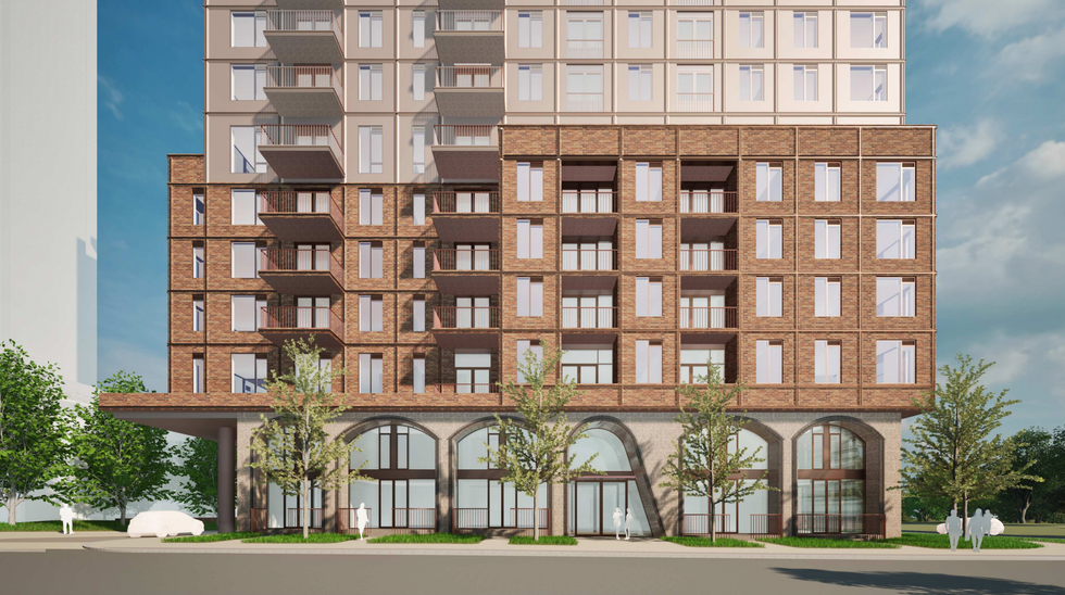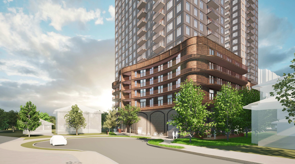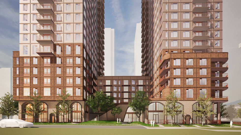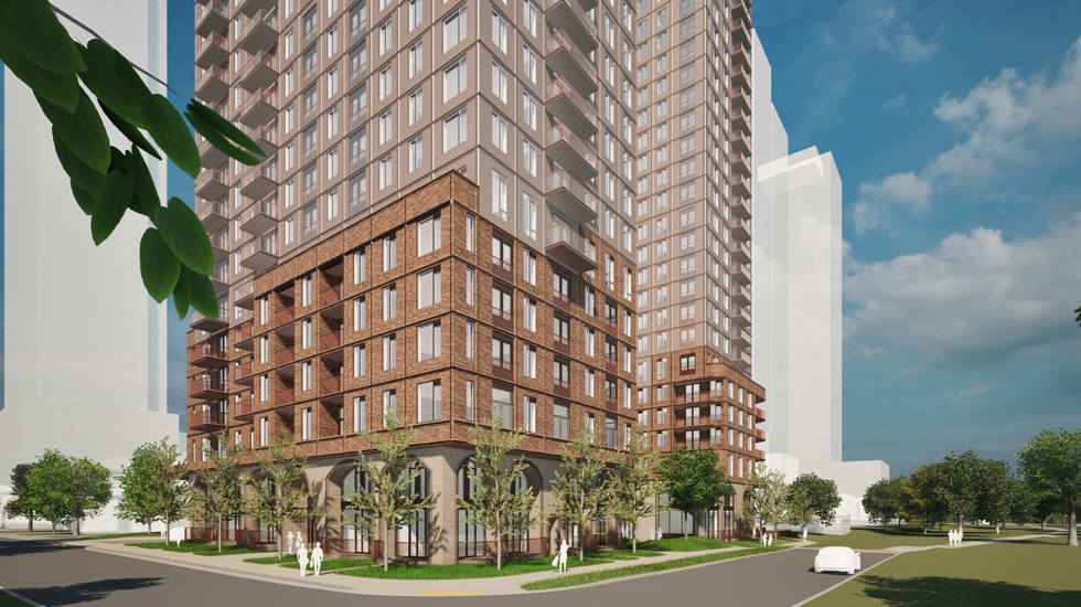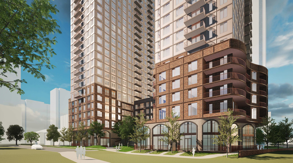 The development is being designed by TACT Architecture, whose renderings depict an attractive podium element with large arched windows at grade and slender towers shooting up from the base.