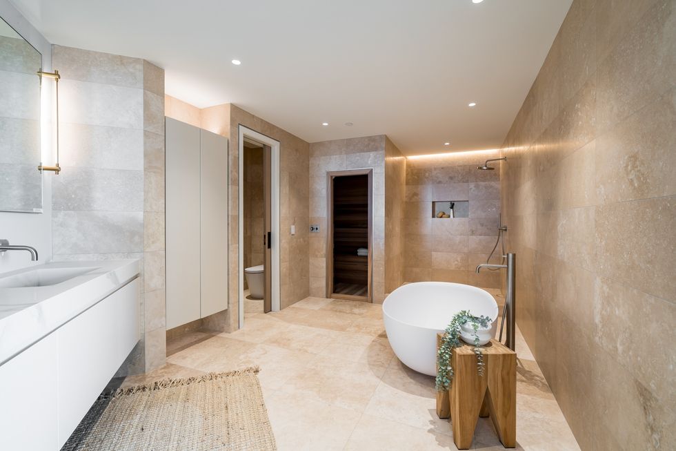 Every detail is high-end, with the kitchen appliances, baths, dressing room, and laundry cabinetry all by Italian luxury manufacturer Scavolini.