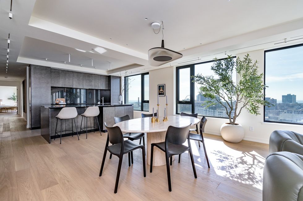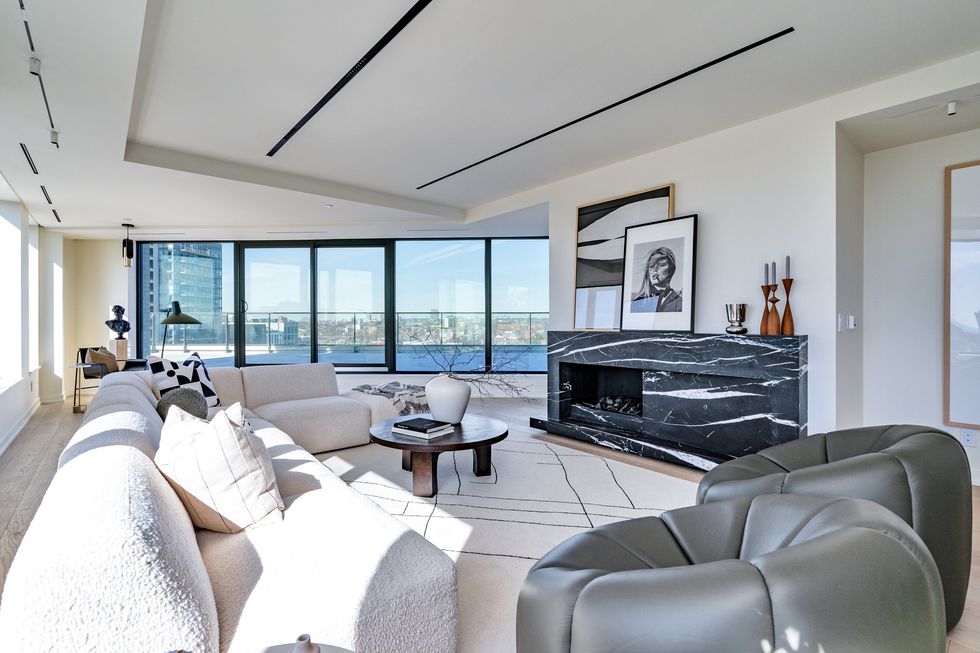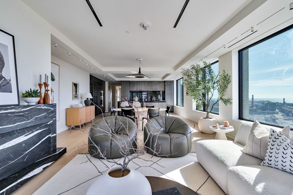The adjacent living room is just as modern and sleek, with a black and white marbled fireplace, European rift-cut wood floors, and sweeping views of the city’s skyline.