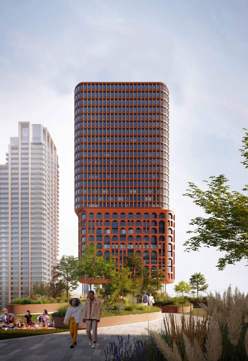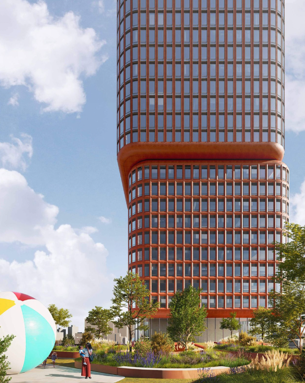 Rafael & Bigauskas Architects has been retained by Fitzrovia to design the infill buildings, and renderings depict a modern, rounded geometric built form with the tower elements divided into separate blocks that slightly cantilever over one another. The windows appear to take on a number of different shapes and sizes and the building is clad in what appears to be a terracotta exterior.