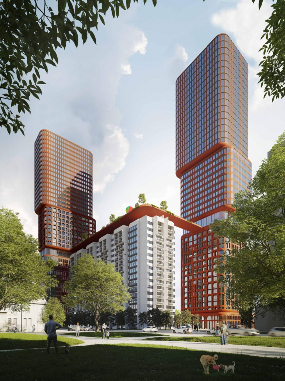 Plans envision a unique linking of the two buildings via the existing 23-storey apartment building, with the recently renovated building serving as a connection to the 39-story North Tower and the 40-storey South Tower. Additionally, the roof of the existing building would serve as a 17,428-sq.-ft outdoor amenity space with a 3,882-sq.-ft green roof. Plus, a 13,002-sq.-ft public park would be realized directly east of the South Tower.