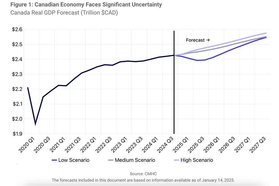 CMHC is forecasting "modest" economic activity in 2025 that should pick up as we head into 2026 and 2027. This projection reflects what the agency sees playing out if the US enacts 25% tariffs on 10% of Canadian goods and the negative economic impacts are "softened by stronger US government spending and higher US demand for imports as a result." Or, the 'medium scenario.'