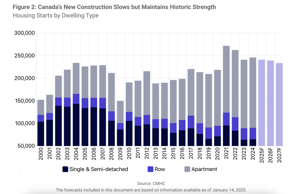 On the rental front, we should continue to see increased construction through 2025-2026, though this trend could wane as rental market conditions "soften," impacting rental starts by 2027. There will also be "a small recovery" for ground-oriented home construction, as developers compete with the resale market to attract presale buyers.