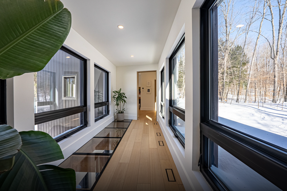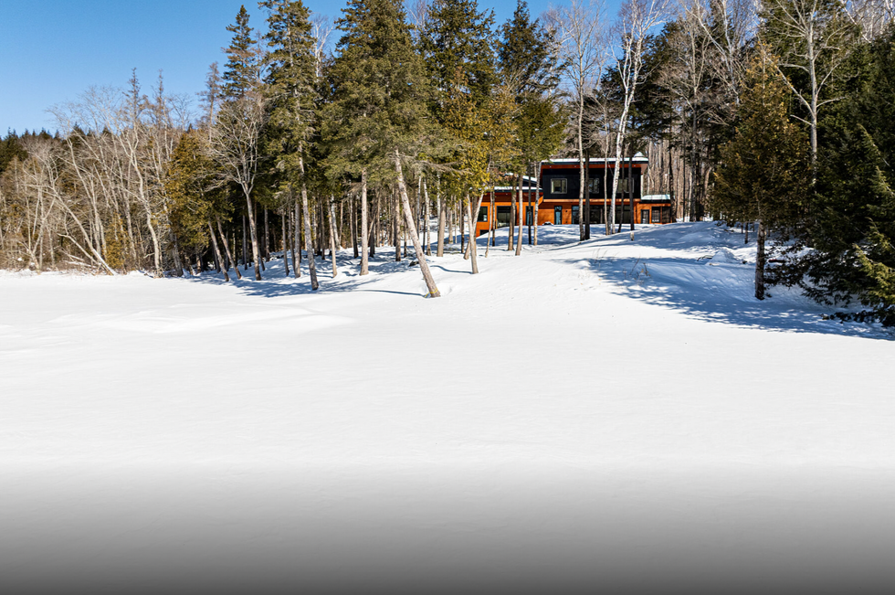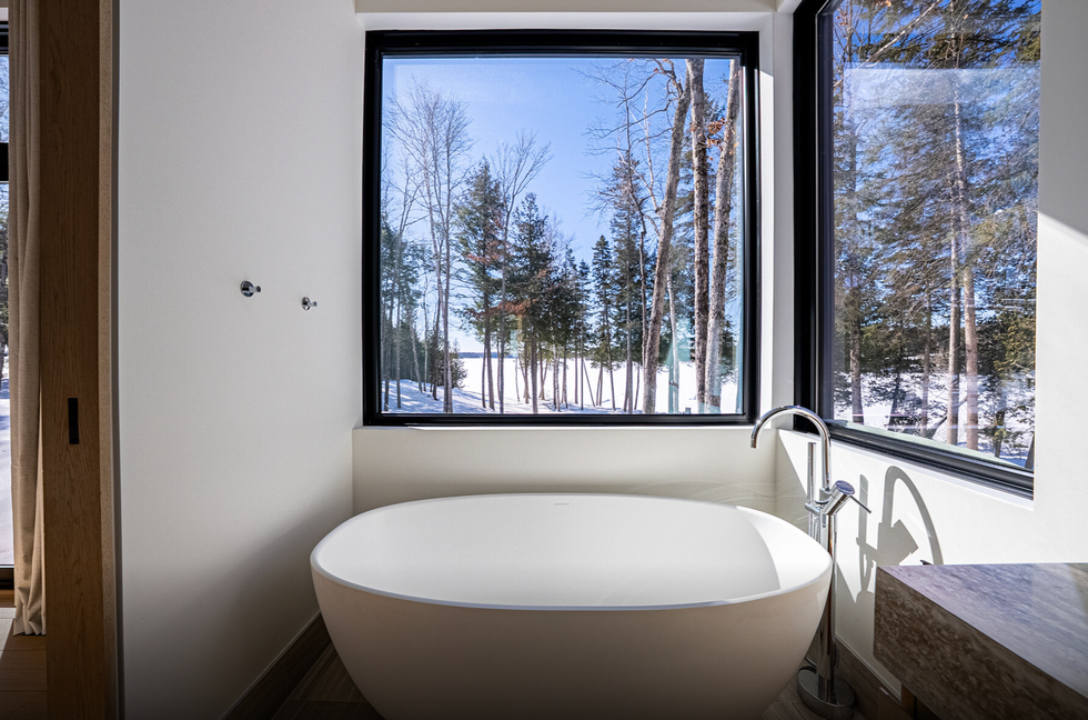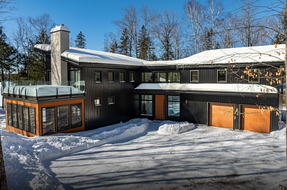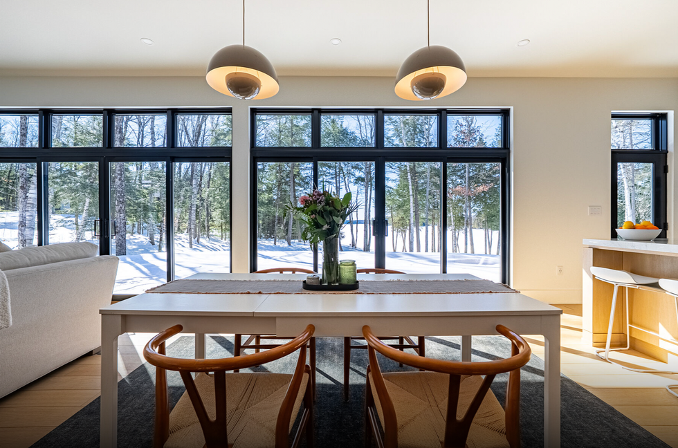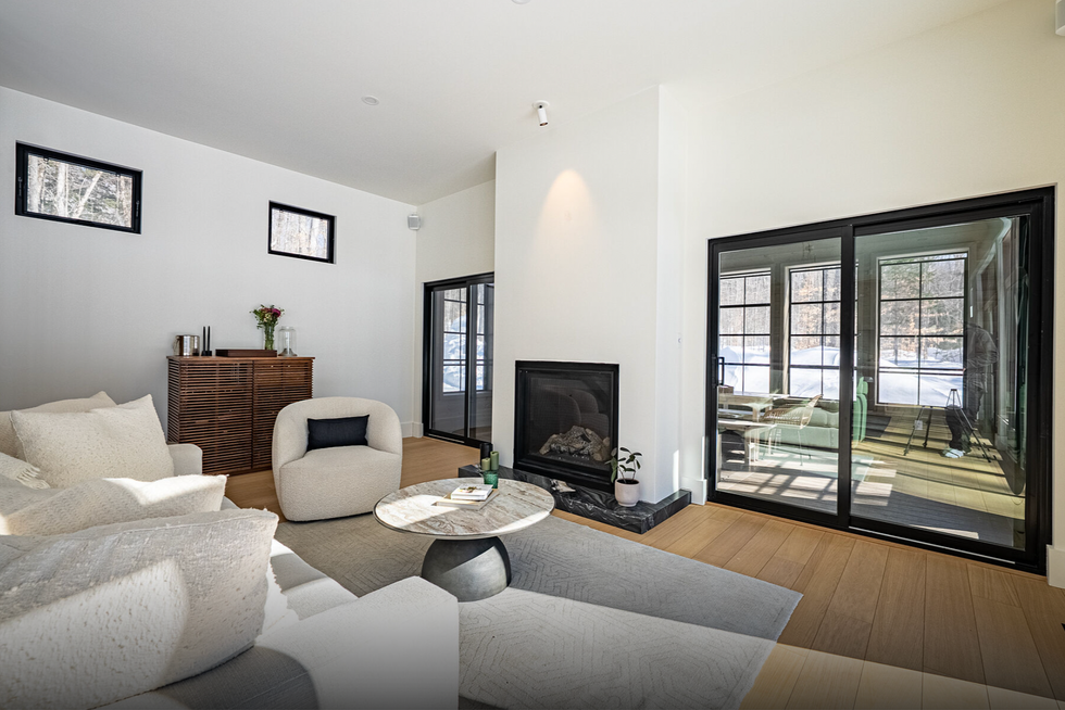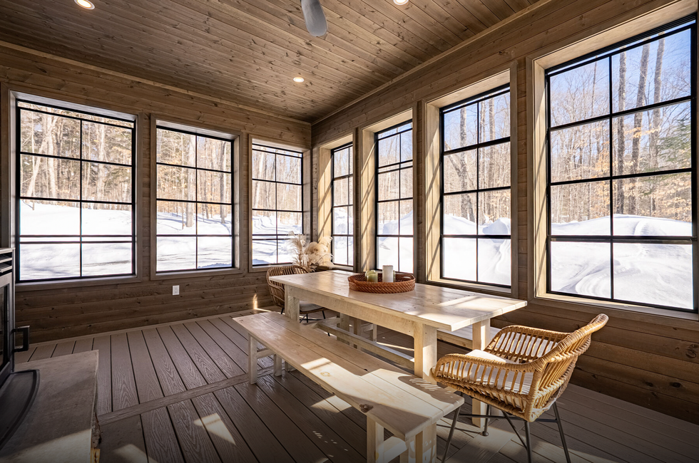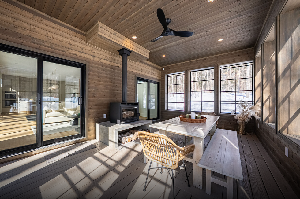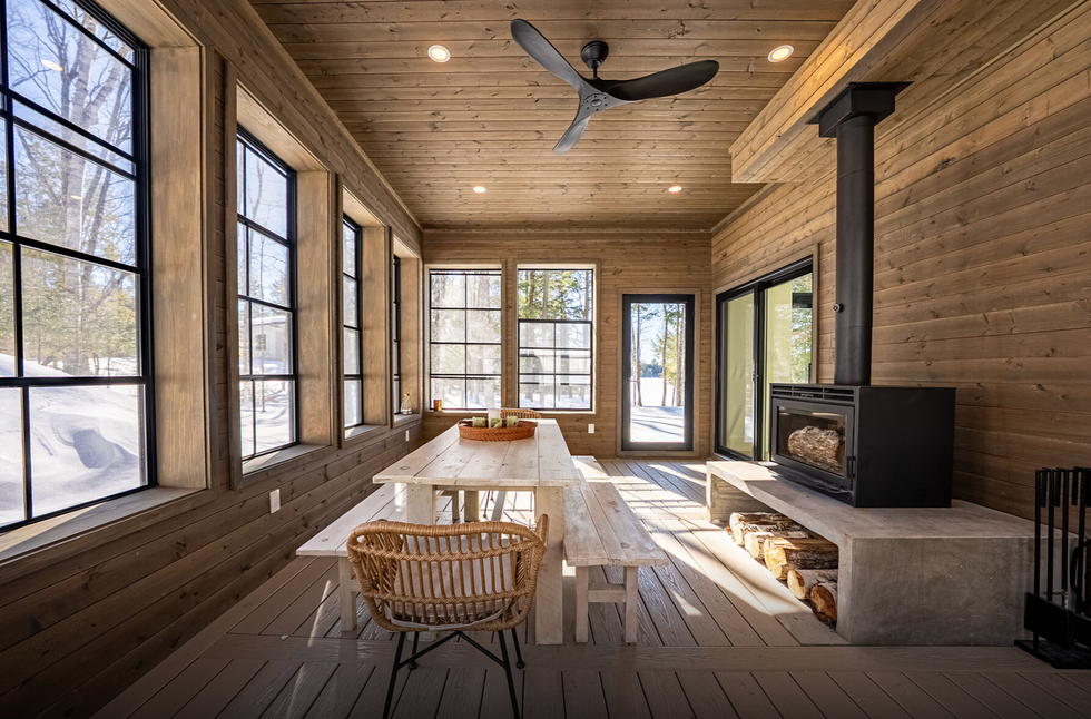 Book-ending the space is a stunning three-season Kawaratha room (sunroom), which features another wood-burning fireplace and offers nearly 360-degree views of the surrounding forrest and lake.