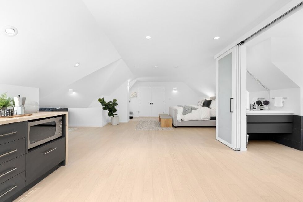 Moving further into the space, you'll find the central living space is as modern as they come, with a dining area, family room, and kitchen sharing an open floor plan. Nearby is also a dedicated dining room — the kind typically reserved for special occasions — that once again nods to that Tudor style.