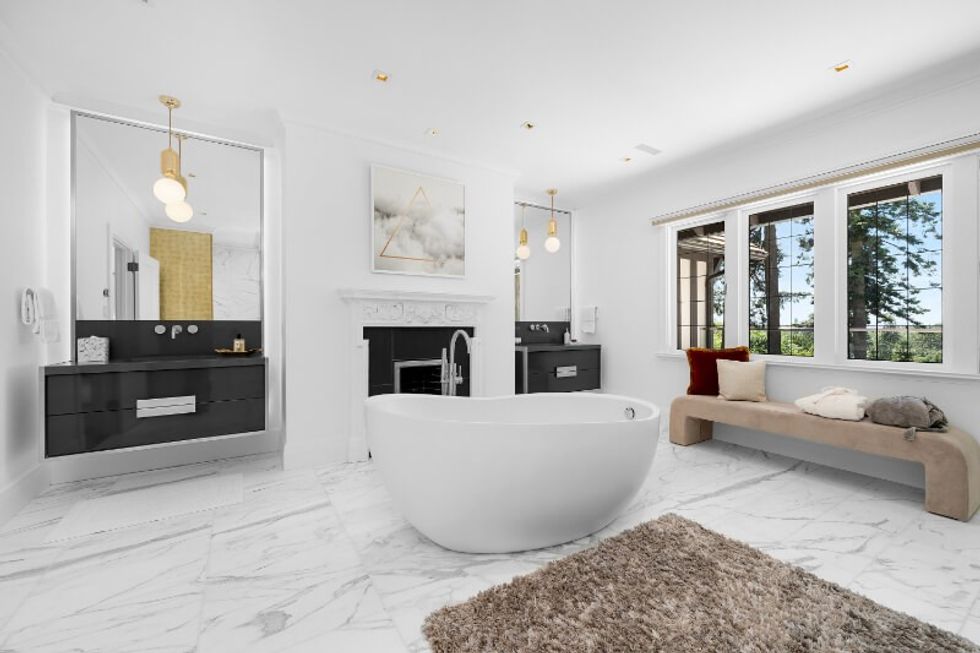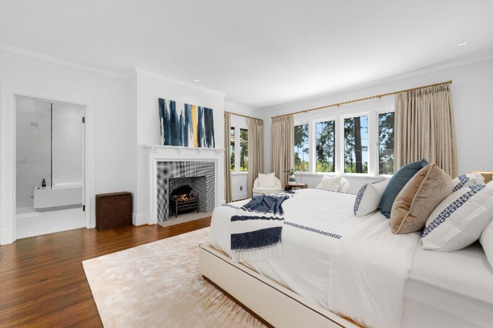 All six bedrooms are located on the uppermost level of the three-storey home, including the 26' x 21' primary retreat — and its luxurious ensuite bath, equipped with two matching vanities, a standalone tub, a glass-enclosed shower, and a fireplace.